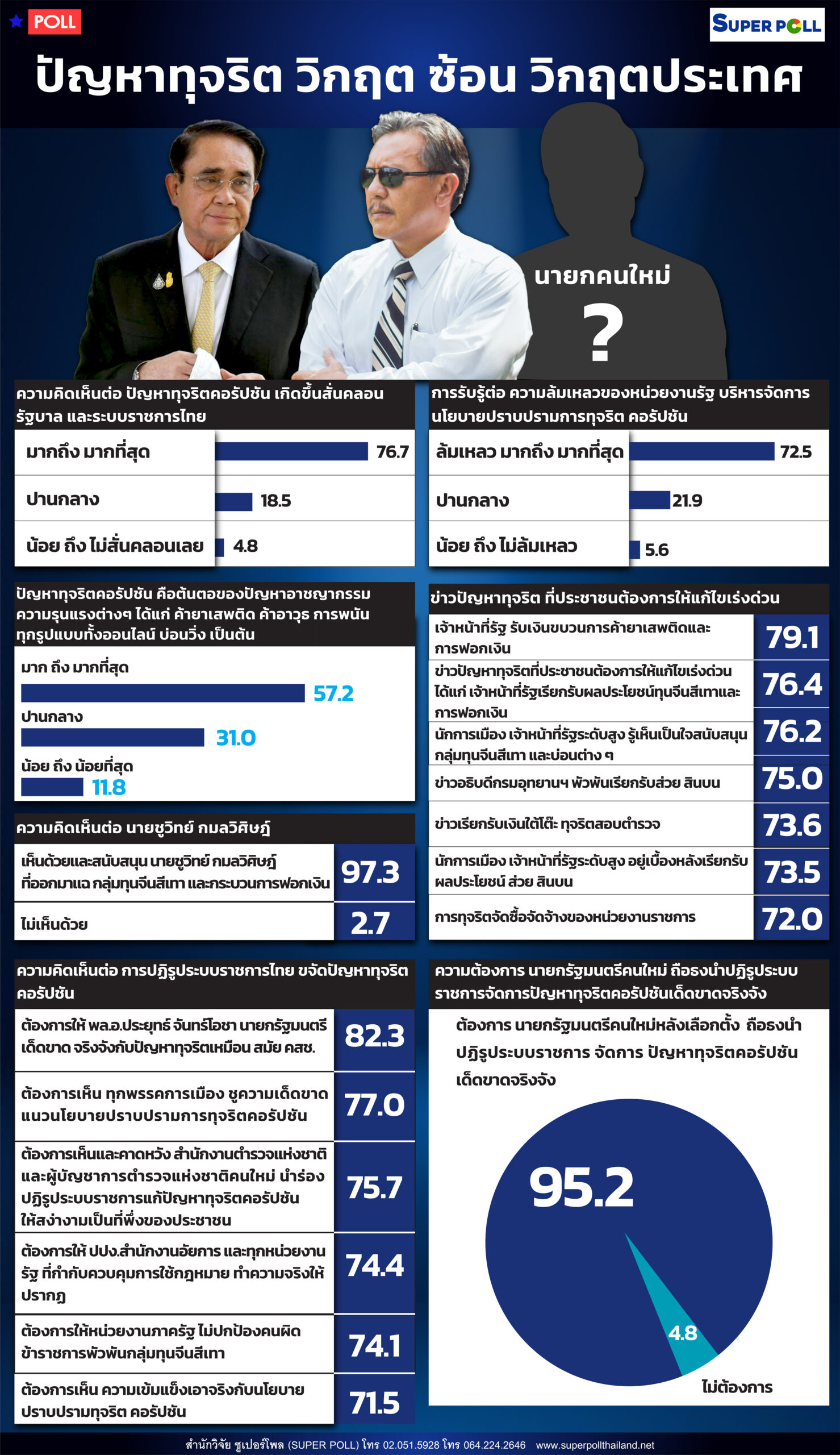 ซูเปอร์โพล 95.2%ต้องการนายกฯคนใหม่ถือธงนำปฏิรูประบบราชการ จัดการปัญหาทุจริต ขณะ 82.3% ต้องการให้ “บิ๊กตู่” จริงจังปราบปรามเหมือนยุค คสช., 76.7% ชี้ปัญหาคอร์รัปชั่นสั่นคลอนรัฐบาล และ 97.3% หนุน”ชูวิทย์” แฉ