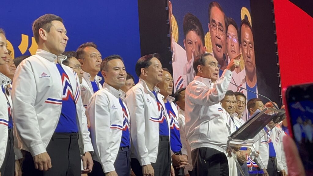 ช่วงหนึ่งมีกองเชียร์ตะโกนว่า’รักลุงๆ’ พล.อ.ประยุทธ์ จึงกล่าวว่า เราเป็นครอบครัวเดียวกัน เหมือนสามีภรรยา ต้องอย่าเบื่อกันต้องรักมากขึ้นตามเวลา ยิ่งแก่ก็ยิ่งรักมากขึ้นทุกวัน ตนปากหวานแต่จริงใจ อย่างไรก็ตามย้อนไปตั้งแต่ปี 2562 เราเข้าสู่การเลือกตั้ง แต่มีงานของเราที่ทำไม่จบตจึงนจำเป็นก้าวมาสู่ตรงนี้หลายอย่างต้องทำต่อ ทำใหม่ ทำเพิ่ม ทำอย่างไรให้เดินหน้าไปให้ได้ และในเมื่อตัดสินใจทางการเมืองร่วมกับพรรคนี้ หวังว่ามีโอกาสทำเรื่องต่างๆ ได้ วันนี้ต้องทำให้เราเข้มแข็งก่อน ประเทศไทยมีอยู่แล้วความมีเสถียรภาพ ความรัก และความสามัคคี ต้องไม่ให้ใครมาทำลายความรักความสามัคคี ซึ่งคนไทยรักสงบ แต่ถึงรบไม่ขลาดต้องต่อสู้ฟันฝ่าไปข้างหน้า