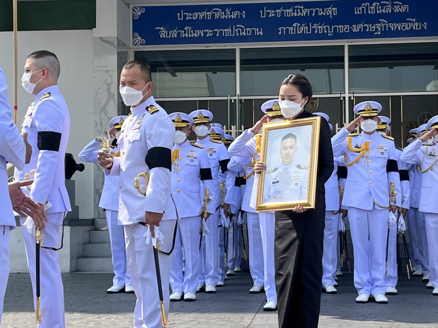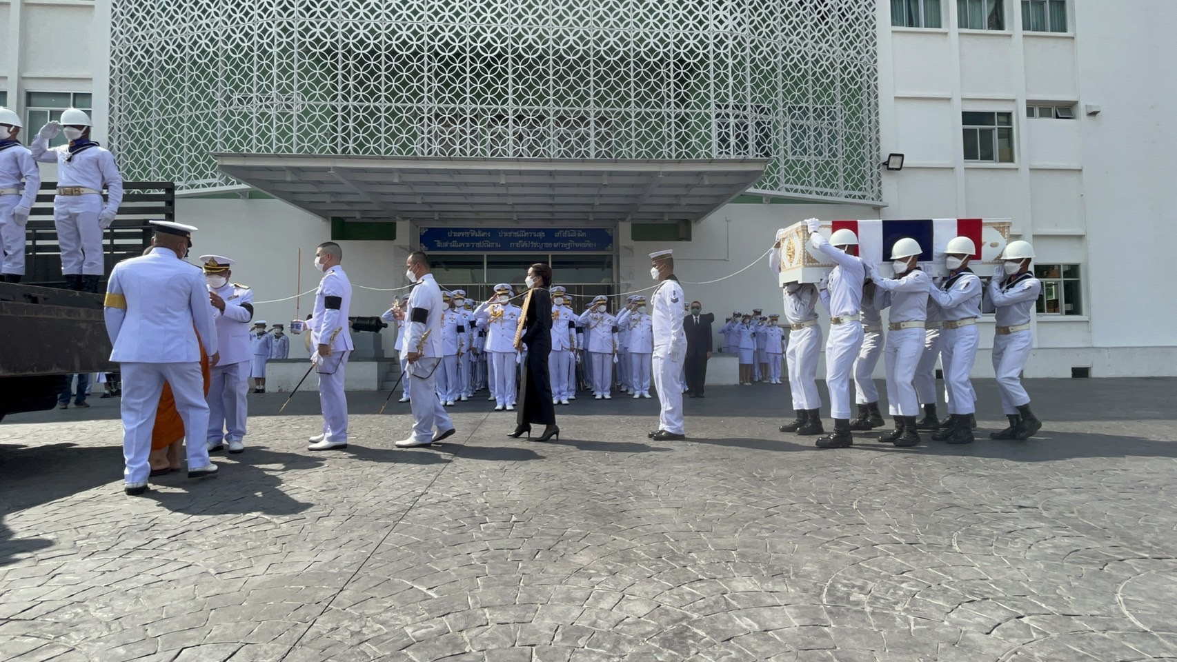 โดยในเวลา 13.00 น. ผู้เข้าร่วมพิธีพร้อม ณ ฐานทัพเรือกรุงเทพฯ เจ้าหน้าที่ลำเลียงศพ แบกพร้อมเดิน จากนั้นพลแตรเป่าเพลงนอน 1 จบ ผู้ควบคุมขบวนฯ สั่ง “หน้าเดิน”เจ้าหน้าที่ลำเลียงศพ เริ่มออกเดิน จากนั้นผบ.กองทหารเกียรติยศ สั่ง ทำความเคารพ “ตรงหน้า ระวัง วันทยาวุธ” ผู้ร่วมพิธีฯ และกำลังพลแถวรายทางทำวันทยหัตถ์ พลแตรเป้าทำความเคารพ