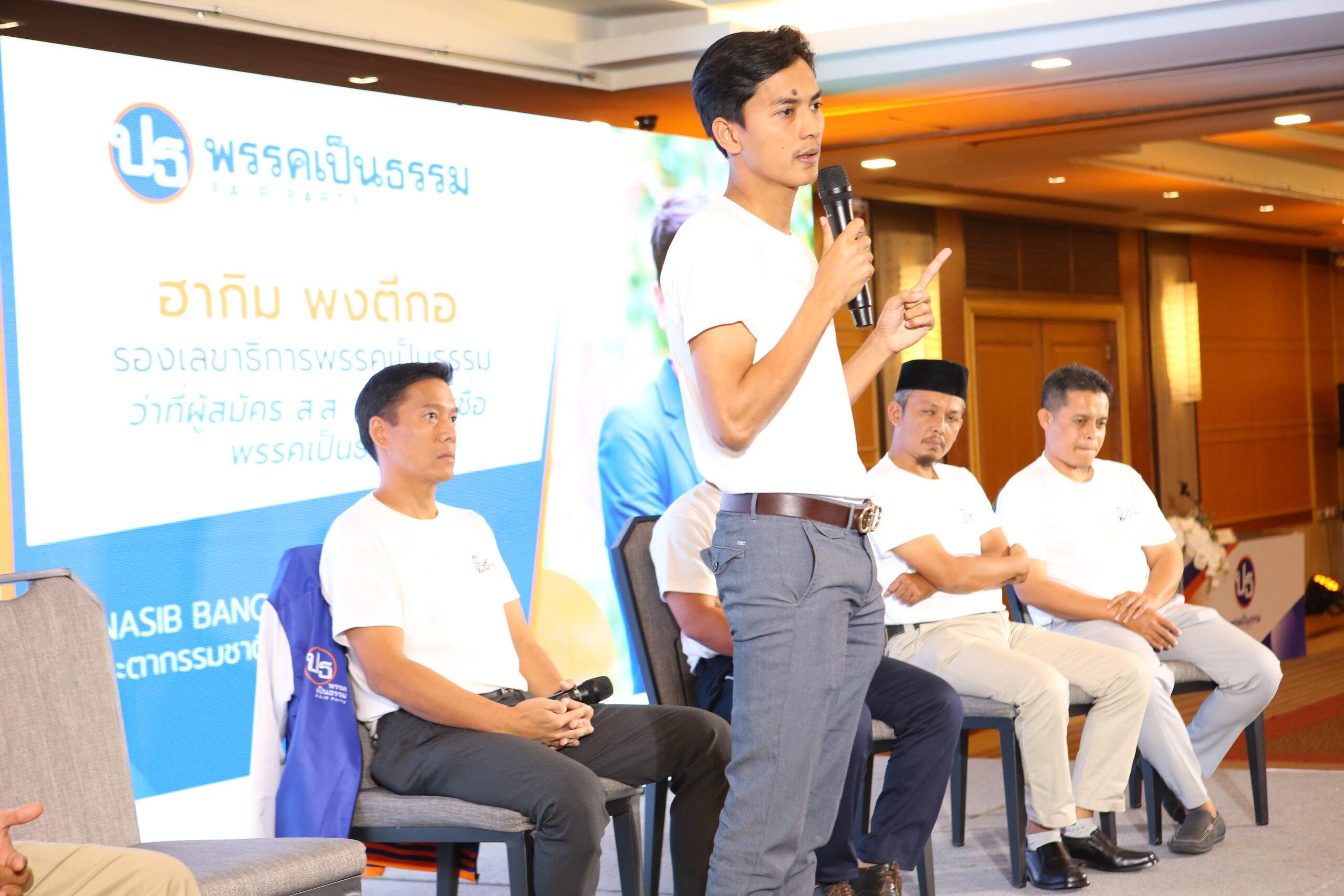 ผมจึงเชื่อมั่นว่าผู้สมัครของเราจะเป็นกลุ่มคนที่จะสร้างพื้นที่ทางการเมืองในจังหวัดชายแดนภาคใต้ให้เข้มแข็งขึ้นขณะเดียวกัน พรรคเป็นธรรมยังได้เปิดตัวนโยบาย “อยู่เย็น เป็นธรรม” โดย นายปิติพงศ์ เต็มเจริญ หัวหน้าพรรคเป็นธรรม เปิดเผยว่า พรรคเป็นธรรมตั้งใจสร้างบ้านให้เป็นที่อยู่ ที่ทำงาน ที่ใช้ชีวิต ลดความเหลื่อมล้ำ สร้างความสุขให้ครอบครัว การพัฒนาคนตั้งแต่วัยเด็กจนถึงวัยเกษียณ นโยบายเศรษฐกิจป็นธรรม