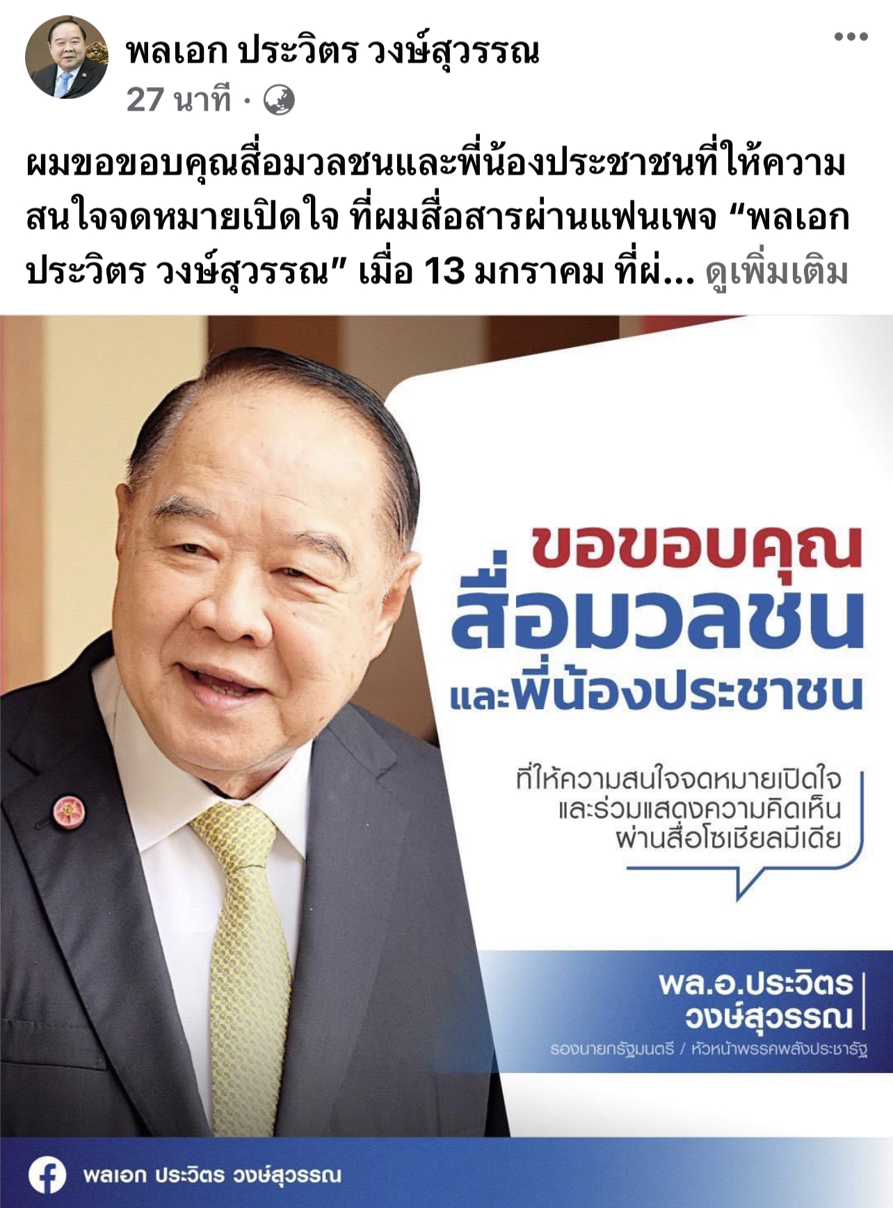 พล.อ.ประวิตร วงษ์สุวรรณ รองนายกรัฐมนตรี โพสต์ข้อความผ่านเพจเฟสบุ๊คประวิตร วงษ์สุวรรณ ระบุว่า ขอขอบคุณสื่อมวลชนและประชาชนที่ให้ความสนใจจดหมายเปิดใจที่สื่อสารผ่านแฟนเพจ “พลเอกประวิตร วงษ์สุวรรณ” เมื่อ 13 ม.ค.ที่ผ่านมา ได้ทราบว่าวันแรกมียอดสืบค้นหาทางกูเกิลถึง 8 แสนครั้ง และเพิ่มขึ้นจนทะลุ 1.5 ล้านครั้ง ในวันที่สอง
