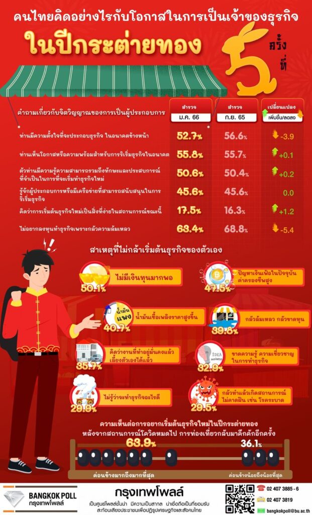 กรุงเทพโพลล์ มหาวิทยาลัยกรุงเทพ ร่วมกับคณะการสร้างเจ้าของธุรกิจและการบริหารกิจการ มหาวิทยาลัยกรุงเทพ สำรวจความเห็นประชาชนเรื่อง “คนไทยคิดอย่างไรกับโอกาสในการเป็นเจ้าของธุรกิจ ในปีกระต่ายทอง (ครั้งที่ 5)” โดยเก็บข้อมูลจากประชาชนทั่วประเทศ โดยการสุ่มสัมภาษณ์ทางโทรศัพท์ จำนวน 1,156 คน ระหว่างวันที่ 11-17 ม.ค.ที่ผ่านมา พบว่า สาเหตุที่ไม่กล้าเริ่มต้นธุรกิจของตัวเอง ร้อยละ 50.1 ระบุ ไม่มีเงินทุนมากพอ,ร้อยละ 47.5 ระบุ ปัญหาเงินเฟ้อในปัจจุบัน ค่าครองชีพสูง,ร้อยละ 40.7 น้ำมันเชื้อเพลิงต่างๆ ราคาสูงขึ้น, ร้อยละ 39.8 กลัวล้มเหลว กลัวขาดทุน, และ ร้อยละ 35. คิดว่างานที่ทำอยู่มั่นคงแล้ว เลี้ยงตัวเองได้แล้ว