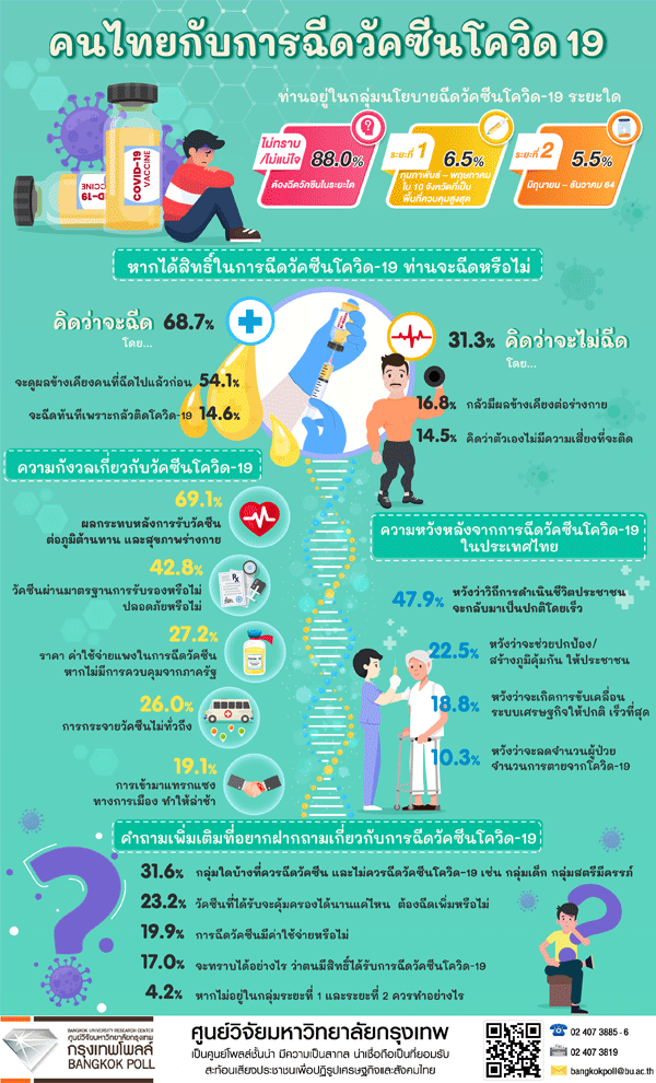 กรุงเทพโพลล์ 47.9%หวังวิถีชีวิตกลับมาเป็นปกติหลังฉีดวัคซีนโควิด 18.8 ขับเคลื่อนเศรษฐกิจได้ดีขึ้น แต่ 88.0% ยังไม่รู้ตัวเองอยู่กลุ่มฉีดวัคซีนระยะใด
