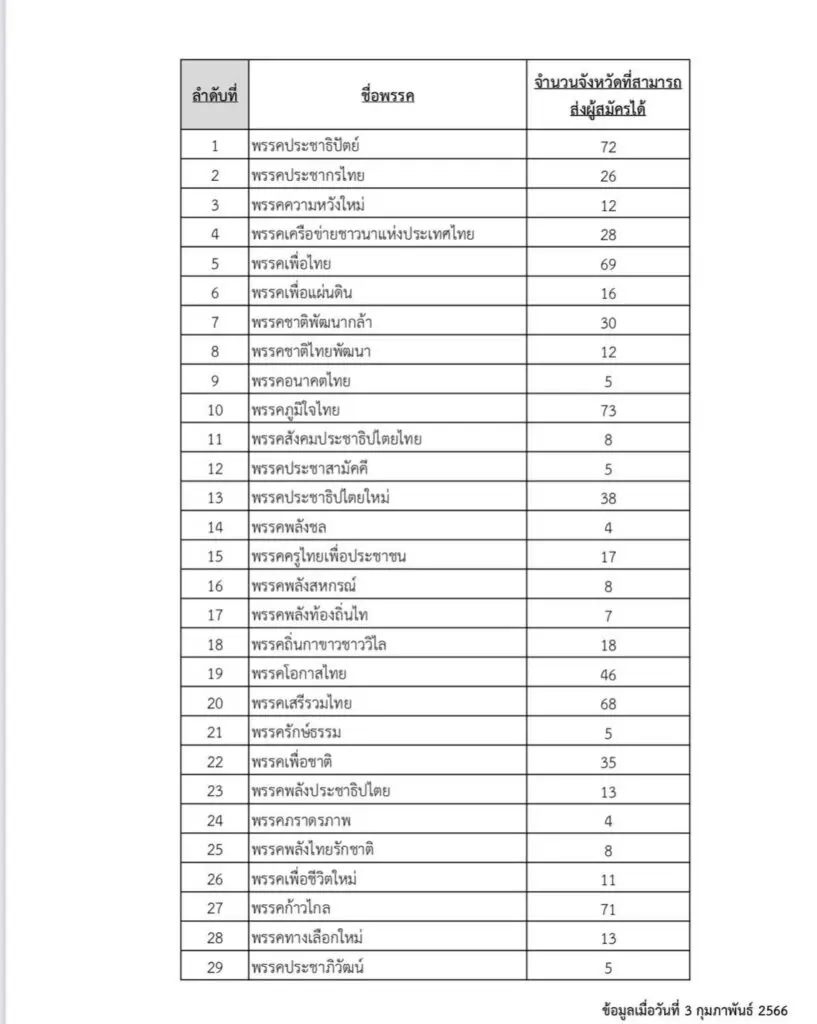 6.พรรคเศรษฐกิจไทย 59 จังหวัด 7.พรรคคลองไทย 55 จังหวัด 8.พรรครวมไทยสร้างชาติ 50 จังหวัด 9.พรรคไทยสร้างไทย 48 จังหวัด 10. พรรคโอกาสไทย 46 จังหวัด ส่วนพรรคไทยภักดี 42 จังหวัด พรรคชาติพัฒนากล้า 30 จังหวัดพรรคชาติไทยพัฒนา 12 จังหวัด พรรคประชาธิปไตยใหม่ 38 จังหวัด พรรคสร้างอนาคตไทย 22 จังหวัด