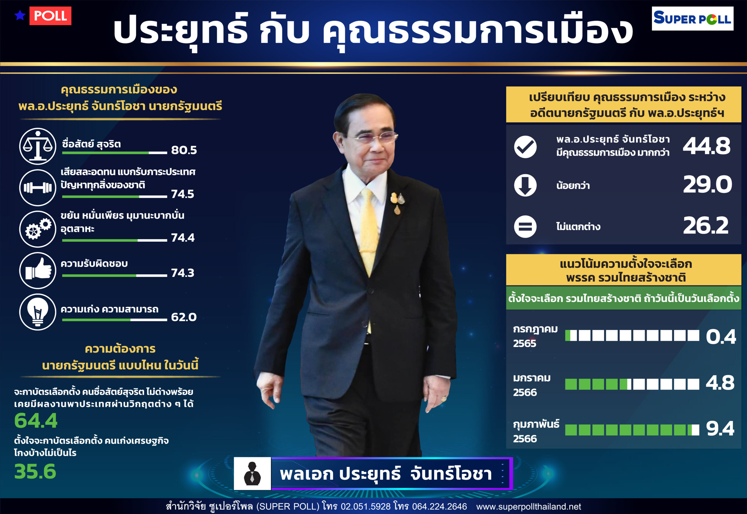ซูเปอร์โพล 80.5%ชู”บิ๊กตู่”ซื่อสัตย์ ขณะ 44.8% มองมีคุณธรรมการเมืองเหนือกว่าอดีตนายกฯ พบแนวโน้มคนจะเลือกพรรครวมไทยสร้างชาติเพิ่มขึ้น