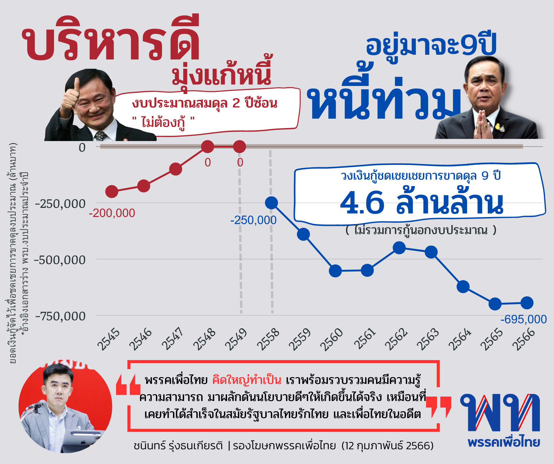 ทั้งนี้ การจัดงบประมาณรายจ่ายประจำปีของรัฐบาล เป็นตัวชี้วัดหนึ่งที่สะท้อนความสามารถของรัฐบาลได้อย่างดี ในสมัย ดร.ทักษิณ ชินวัตร อดีตนายกรัฐมนตรี เคยประกาศยุทธศาสตร์“4 ปีซ่อม 4 ปีสร้าง” และ “คิดใหม่ ทำใหม่” แก้ปัญหาหนี้สินและสร้างความเจริญให้ประเทศมากมาย จนสามารถจัดงบประมาณสมดุล คือไม่จำเป็นต้องกู้มาชดเชยค่าใช้จ่ายใดๆของภาครัฐได้อย่างต่อเนื่องในปี 2548 และ 2549 แตกต่างจากยุคพลเอกประยุทธ์