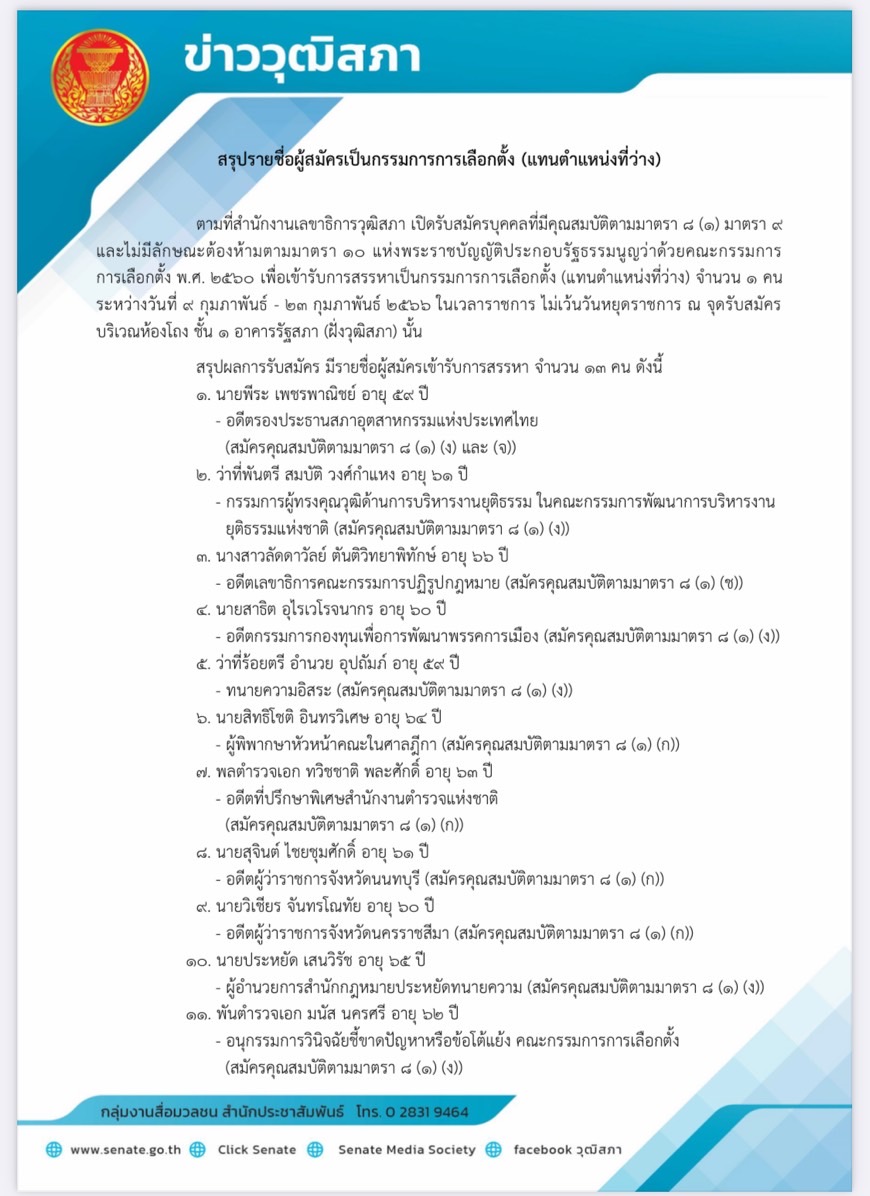 ตามที่สำนักงานเลขาธิการวุฒิสภา เปิดรับสมัครบุคคลที่มีคุณสมบัติตามมาตรา 8 (1) มาตรา 9 และไม่มีลักษณะต้องห้ามตามมาตรา 10 แห่งพระราชบัญญัติประกอบรัฐธรรมนูญว่าด้วยคณะกรรมการการเลือกตั้ง พ.ศ. 2560 เพื่อเข้ารับการสรรหาเป็นกรรมการการเลือกตั้ง (แทนตำแหน่งที่ว่าง) จำนวน 1 คน ระหว่างวันที่ 9 กุมภาพันธ์ – 23 กุมภาพันธ์ 2566 ในเวลาราชการ ไม่เว้นวันหยุดราชการณ จุดรับสมัคร บริเวณห้องโถง ชั้น 1 อาคารรัฐสภา (ฝั่งวุฒิสภา) นั้น