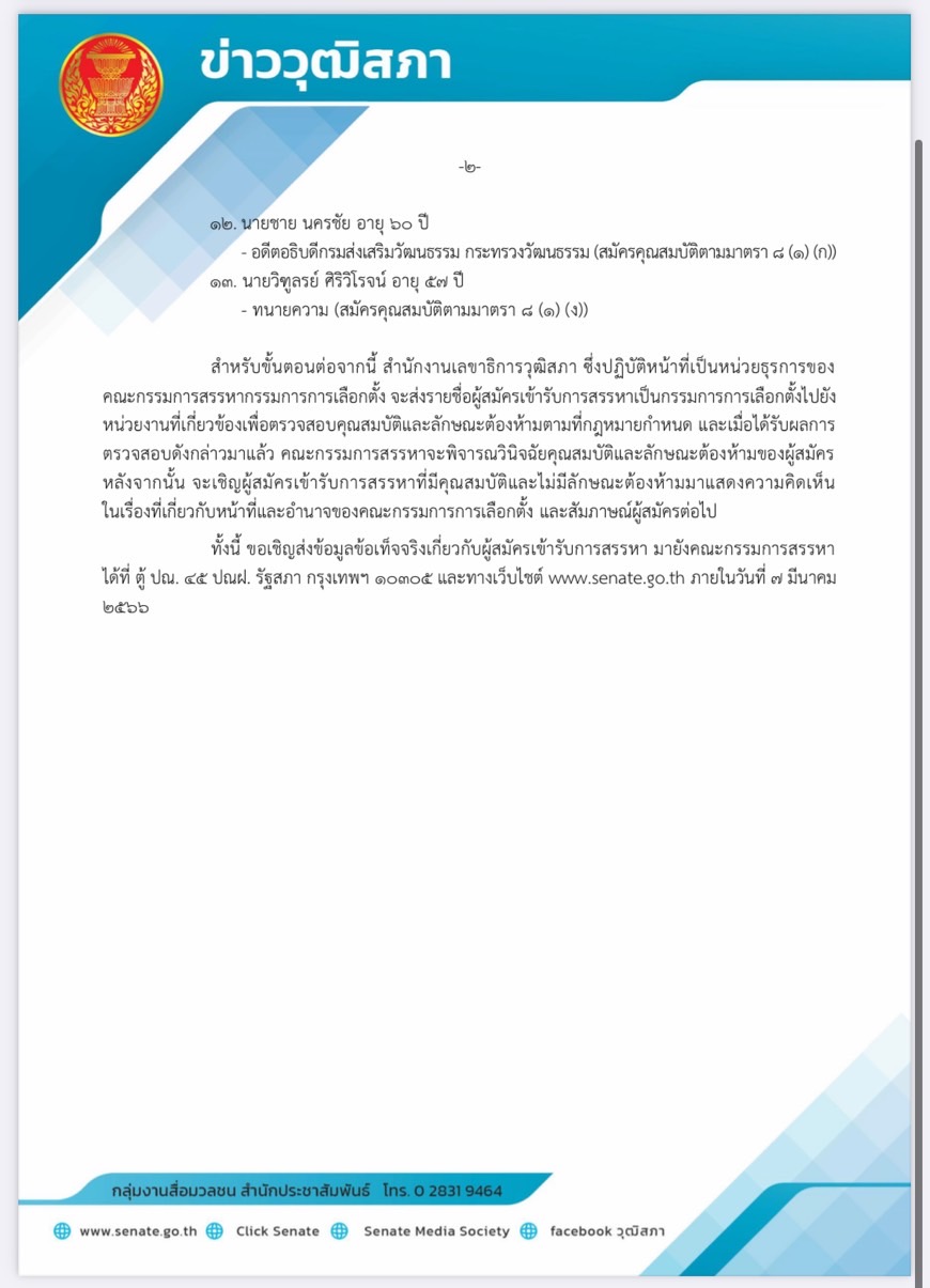 ทั้งนี้ ขอเชิญส่งข้อมูลข้อเท็จจริงเกี่ยวกับผู้สมัครเข้ารับการสรรหา มายังคณะกรรมการสรรหา ได้ที่ ตู้ ปณ. 45 ปณฝ. รัฐสภา กรุงเทพฯ 10305 และทางเว็บไชต์ www.senate.go.th ภายในวันที่ 7 มีนาคม