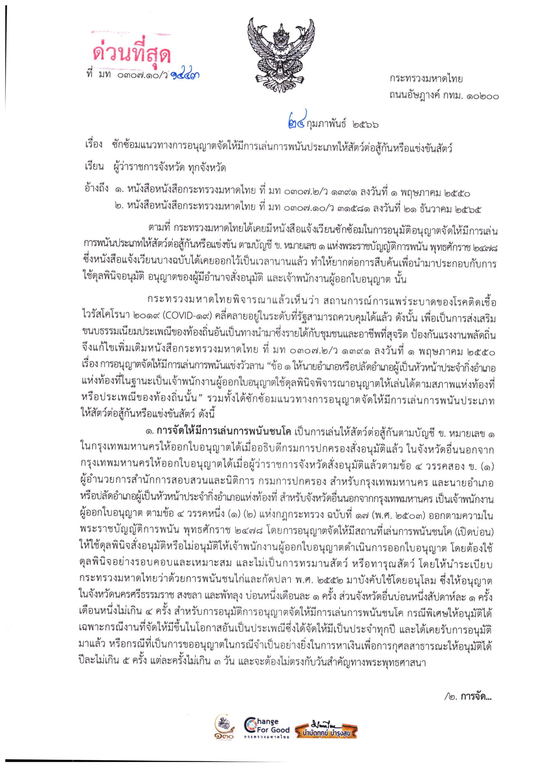 มหาดไทยส่งหนังสือด่วน ถึงผู้ว่าฯ ทั่วประเทศ อนุญาตเปิดบ่อนไก่ – วัวชน ให้ยึดระเบียบเปอดบ่อน ปี52 ห้ามเด็กและเยาวชน เข้าบ่อนเล่นพนัน คุมเข้ม ห้ามพกพาอาวุธ
