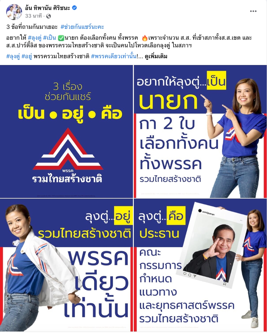 น.ส.ทิพานัน ศิริชนะ รองโฆษกประจำสำนำนายกรัฐมนตรี ในฐานะสมาชิกพรรครวมไทยสร้างชาติ โพสต์ข้อความในเพจเฟซบุ๊กส่วนตัว “อ้น ทิพานัน ศิริชนะ” เป็นภาพพร้อมข้อความระบุว่า