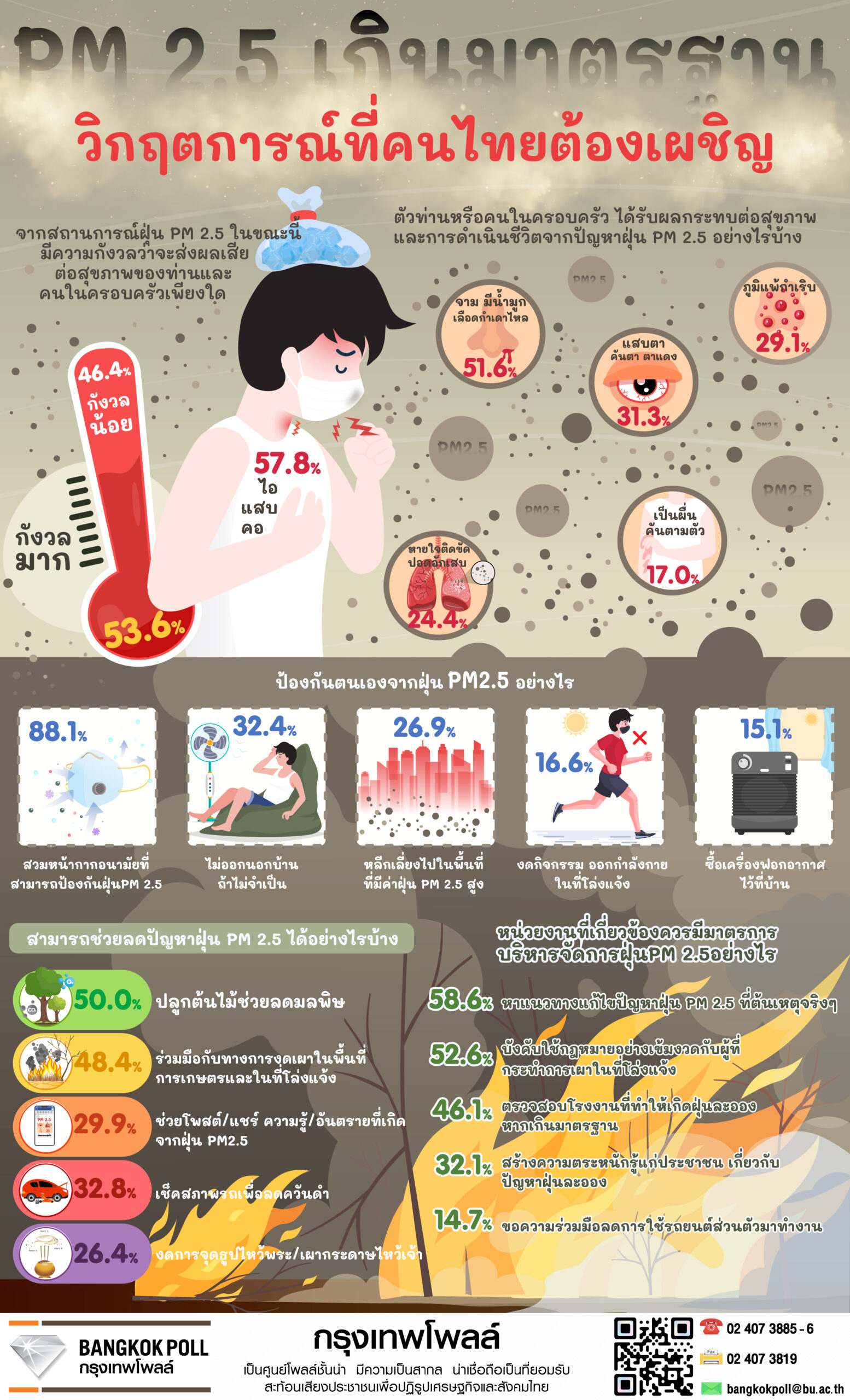 “กรุงเทพโพลล์” มหาวิทยาลัยกรุงเทพ เปิดเผยผลสำรวจเรื่อง “PM 2.5 เกินมาตรฐาน วิกฤตการณ์ที่คนไทยต้องเผชิญ” โดยเก็บข้อมูลจากประชาชนทั่วประเทศ ด้วยการสัมภาษณ์ทางโทรศัพท์จำนวน 1,071 คน เพื่อสอบถามความคิดเห็นของประชาชนเกี่ยวกับความกังวลต่อสุขภาพ และผลกระทบที่ได้รับจากสถานการณ์ฝุ่น PM 2.5 เกินค่ามาตรฐาน พบว่า ประชาชนส่วนใหญ่ร้อยละ 53.6 มีความกังวลมากถึงมากที่สุดว่าสถานการณ์ฝุ่น PM 2.5 จะส่งผลเสียต่อสุขภาพของตนเองและคนในครอบครัว