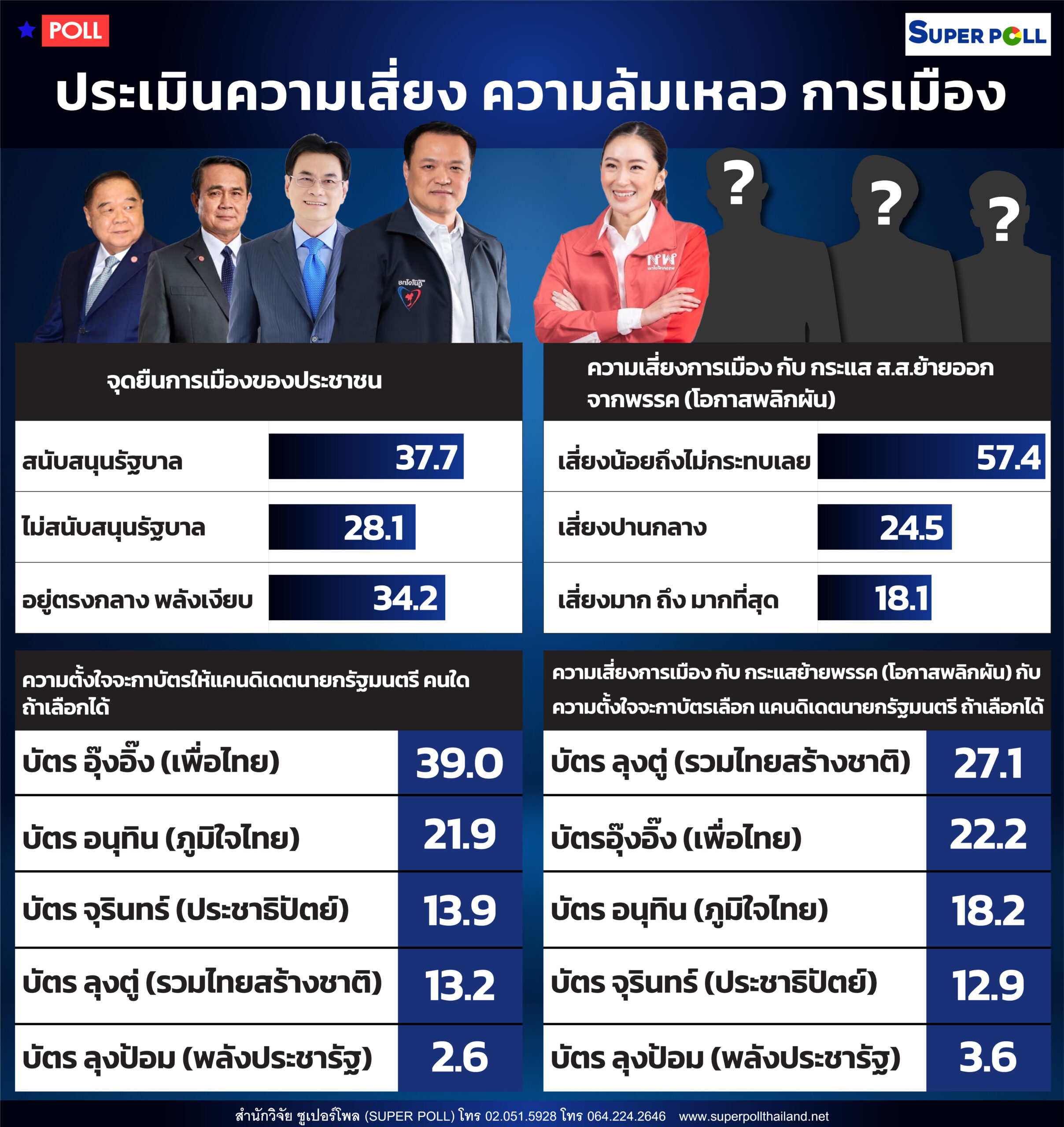 ซูเปอร์โพล 39% หนุน อุ๊งอิ๊ง นั่งนายกฯ “อนุทิน” รั้งที่ 2 ขณะ 37.7% หนุนรัฐบาลทำงานต่อ