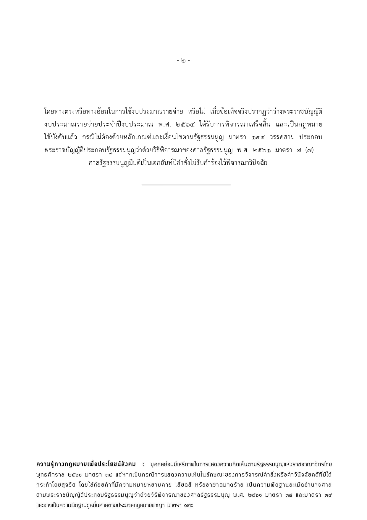 เมื่อข้อเท็จจริงปรากฏว่าร่างพ.ร.บ.งบประมาณรายจ่ายประจำปีงบประมาณ พ.ศ. 2564 ได้รับการพิจารณาเสร็จสิ้น และเป็นกฎหมายใช้บังคับแล้ว กรณีจึงไม่ต้องด้วยหลักเกณฑ์และเงื่อนไขตามรัฐธรรมนูญ มาตรา 144 วรรคสาม ประกอบพ.ร.ป.ว่าด้วยวิธีพิจารณาของศาลรัฐธรรมนูญ พ.ศ. 2561 มาตรา 7 (7)