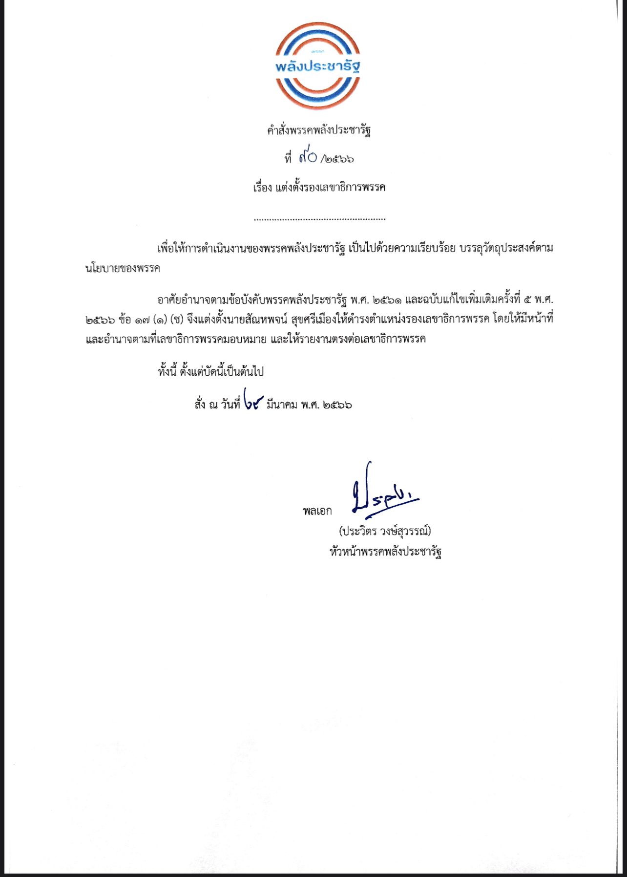 พล.อ.ประวิตร วงษ์สุวรรณ หัวหน้าพรรคพลังประชารัฐ ลงนามคำสั่งพรรคพลังประชารัฐ ที่ 90/2566 เรื่องแต่งตั้งรองเลขาธิการพรรค เพื่อให้การดำเนินงานของพรรคพลังประชารัฐ เป็นไปด้วยความเรียบร้อย บรรลุวัตถุประสงค์ตาม นโยบายของพรรค อาศัยอำนาจตามข้อบังคับพรรคพลังประชารัฐ พ.ศ. 2561 และฉบับแก้ไขเพิ่มเติมครั้งที่ 5 พ.ศ. 2566 ข้อ 17(1) (ช) จึงแต่งตั้งนายสัณหพจน์ สุขศรีเมือง ให้ดำรงตำแหน่งรองเลขาธิการพรรค โดยให้มีหน้าที่ และอำนาจตามที่เลขาธิการพรรคมอบหมาย และให้รายงานตรงต่อเลขาธิการพรรค ทั้งนี้มีคำสั่งตั้งแต่วันที่ 29 มีนาคม 2566
