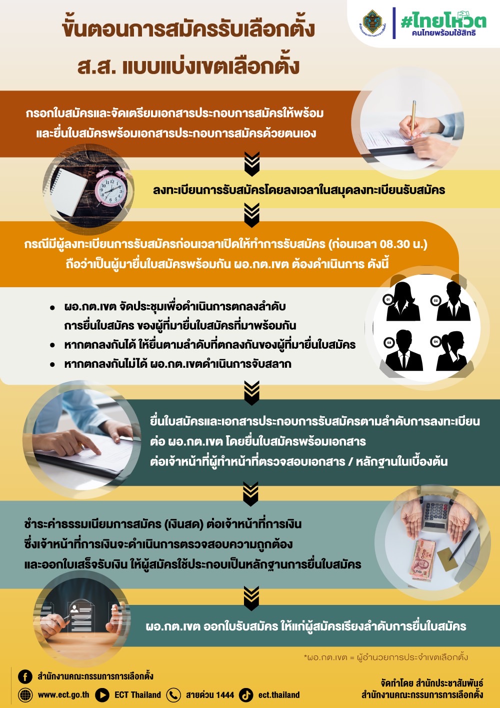 และชำระค่าธรรมเนียมการสมัครเป็นเงินสดต่อเจ้าหน้าที่การเงิน ก่อนออกใบเสร็จ เพื่อให้ผู้สมัครใช้ประกอบเป็นหลักฐานการยื่นสมัคร จากนั้น ผอ.กต.เขต จะออกใบสมัครโดยเรียงลำดับการยื่นใบสมัคร