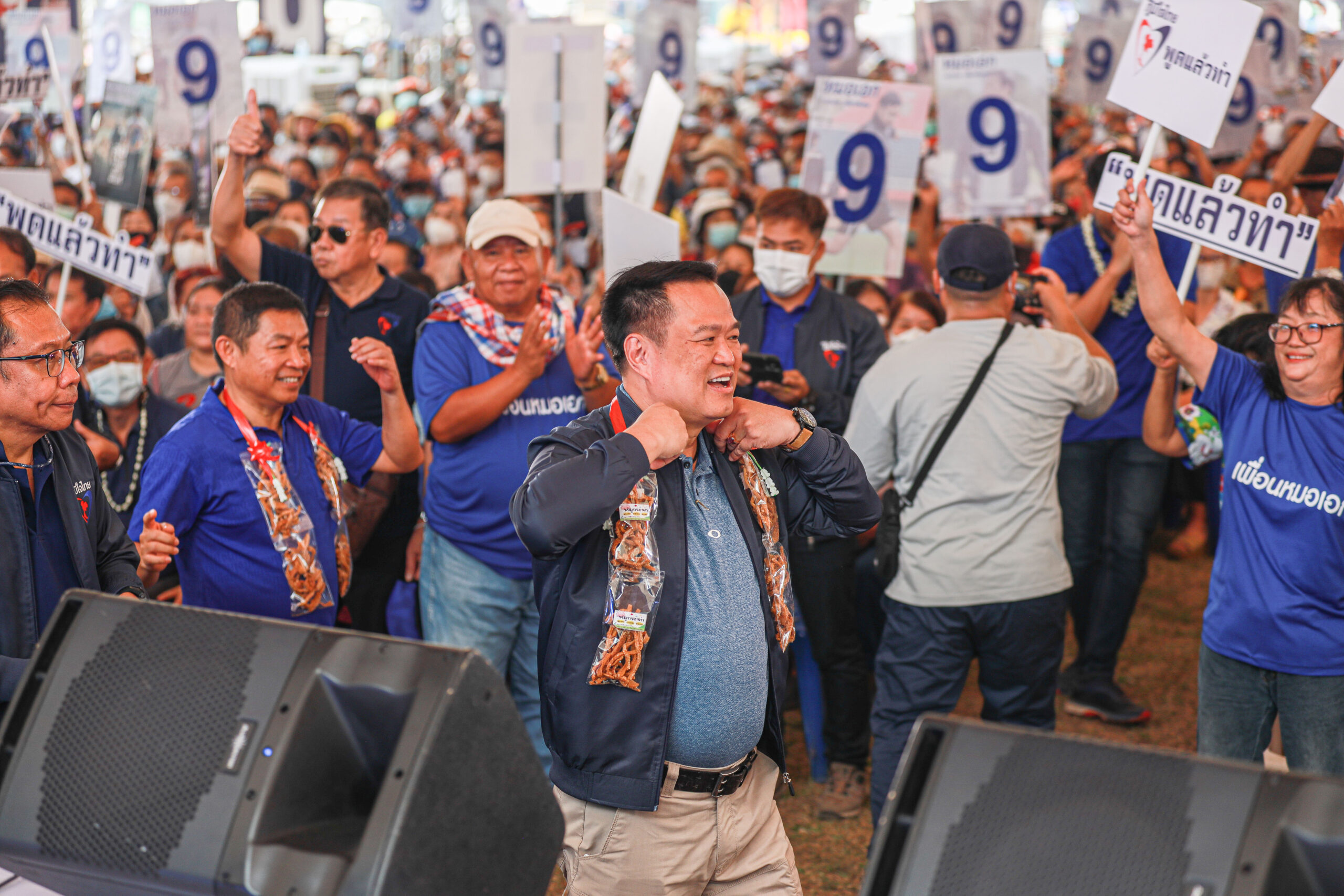 นายอนุทิน กล่าวว่า ขอบคุณนักนักเจ้า ขอบคุณขนาดเจ้า อากาศฮ้อนจะอี้ ก็ยังมาต้อนฮับอย่างอบอุ่น พี่น้องมาต้อนฮับ ขนาดนี้ จะไม่ได้หัวใจผมไปได้จะได๋”