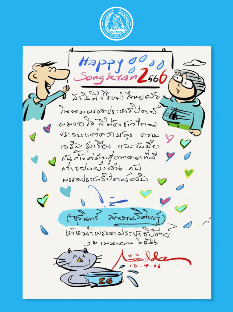 นายจุรินทร์ ลักษณวิศิษฏ์ หัวหน้าพรรคประชาธิปัตย์ เขียนภาพการ์ตูนอู๊ดด้า โพสต์ผ่าน Facebook “จุรินทร์ ลักษณวิศิษฏ์ Aoodda อวยพรเนื่องในวันสงกรานต์ 2566 ระบุว่า