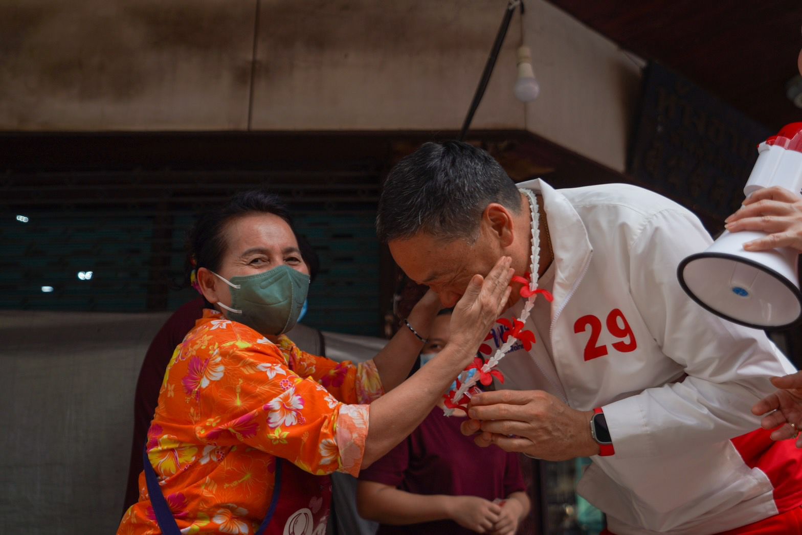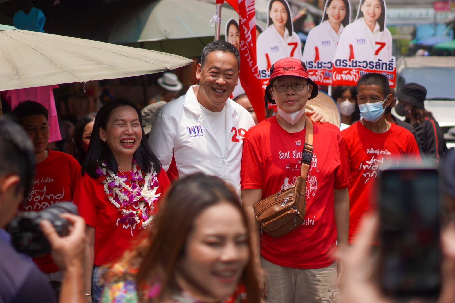 นายเศรษฐา ทวีสิน แคนดิเดตนายกรัฐมนตรีพรรคเพื่อไทย และประธานที่ปรึกษาหัวหน้าครอบครัวเพื่อไทย พร้อมกับนายจักรพงษ์ แสงมณี นายทะเบียนพรรคเพื่อไทย, น.ส.ลิณธิภรณ์ วริณวัชรโรจน์ รองเลขาธิการ และรักษาการโฆษกพรรคเพื่อไทย, น.ส.ขัติยา สวัสดิผล ผู้สมัคร ส.ส.บัญชีรายชื่อ พรรคเพื่อไทย พร้อมด้วยน.ส.ชะวรลัทธิ์ ชินธรรมมิตร ผู้สมัคร ส.ส.ราชบุรี พรรคเพื่อไทย เขต 4 เดินตลาดป่านโป่ง