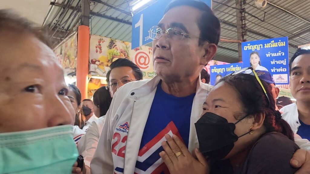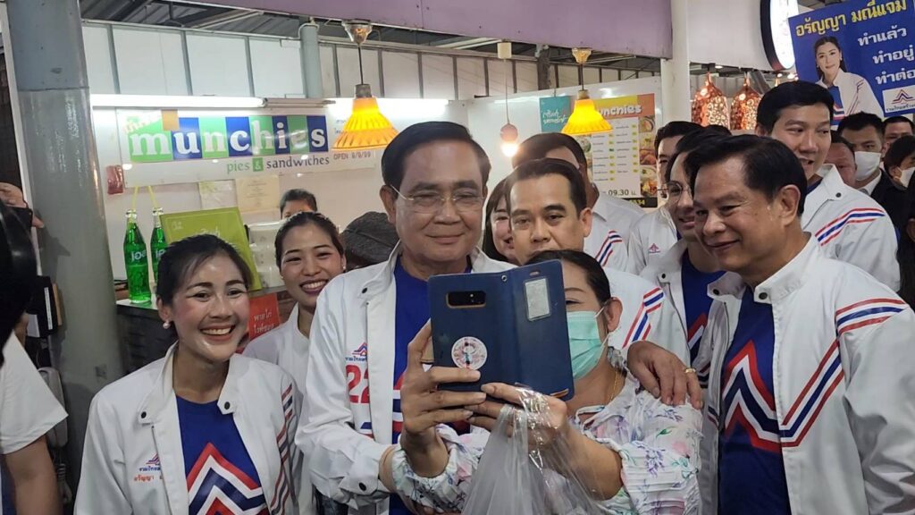 พลเอกประยุทธ์ จันทร์โอชา นายกรัฐมนตรีและรัฐมนตรีว่าการกระทรวงกลาโหม ในฐานะประธานยุทธศาสตร์พรรคและแคนดิเดตนายกรัฐมนตรีพรรครวมไทยสร้างชาติ พร้อมด้วยนายพีระพันธุ์ สาลีรัฐวิภาค หัวหน้าพรรค นายเอกณัฐ พร้อมพันธ์ เลขาธิการพรรค นายอนุชา บูรพชัยศรี รองหัวหน้าพรรค นางสาวทิพนันท์ ศิริชนะ ผู้สมัครส.ส.บัญชีรายชื่อพรรค ลงพื้นที่หาเสียงช่วยผู้สมัครส.ส.กทม.เขต 8 จตุจักรหลักสี่ นางสาวอรัญญา มณีแจ่ม ตลาดบองมาเช่