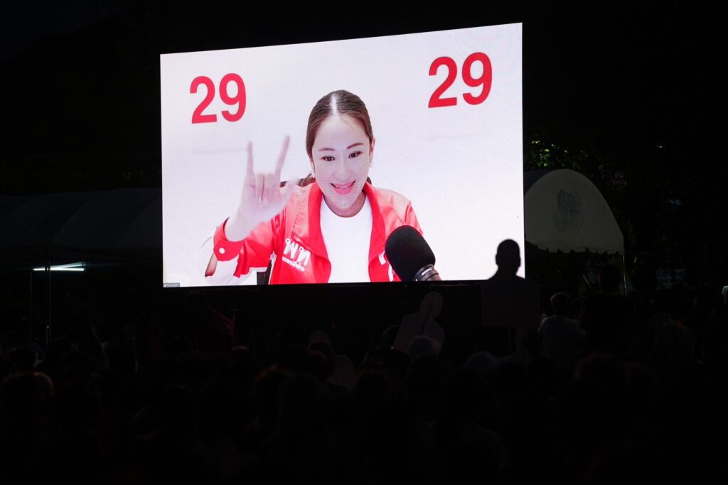 โดยน.ส.แพทองธาร ปราศรัยผ่านระบบวิดิโอคอล พร้อมด้วยนายปิฎก สุขสวัสดิ์ สามี ซึ่งเป็นคนนครศรีธรรมราช โดยทักทายฝากความคิดถึงห่วงใยในเรื่องของวิกฤตปากท้อง การขยายโอกาสลดรายจ่ายและเพิ่มรายได้ให้พี่น้อง พรรคเพื่อไทยอยากเห็นประชาชนมีราคาพืชผลการเกษตร ทั้งราคายางพารา ราคาน้ำมันปาล์มสูงขึ้นตลอดจนสินค้าประมงที่ซบเซาลงไปก็ควรจะพลิกฟื้นกลับมาสร้างรายได้ให้กับพี่น้อง โดยนายกรัฐมนตรีในรัฐบาลของพรรคเพื่อไทยจะเดินทางไปขายสินค้าเกษตร เจรจาการค้า เพื่อเปิดตลาดใหม่ สร้างรายได้เข้าประเทศ รวมถึงนโยบายกระเป๋าเงินดิจิทัลของพรรคเพื่อไทย ที่จะแจกให้คนไทยทุกคนที่อายุ 16 ปีขึ้นไปเพื่อกระตุ้นเศรษฐกิจซึ่งพี่น้องชาวสวนยางก็จะได้ โดยพรรคเพื่อไทยขอแรงสนับสนุนจากชาวเมืองคอน เลือกเพื่อไทยทั้ง 2 ใบ ทั้งคนทั้งพรรค