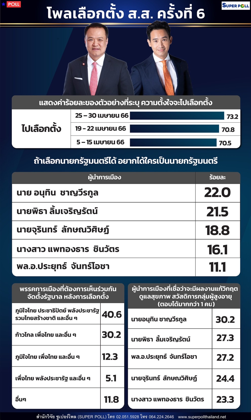 โพลเลือกตั้ง ส.ส. ครั้งที่ 6 “อนุทิน – พิธา” ตีคู่สูสี เสียงห่างไม่ถึง 1% เหมาะนั่งนายกฯ คนตั้งใจจะไปเลือกตั้งเพิ่ม “ภูมิใจไทย-ประชาธิปัตย์”ยังเป็นแกนนำตั้งรัฐบาลไม่เปลี่ยน