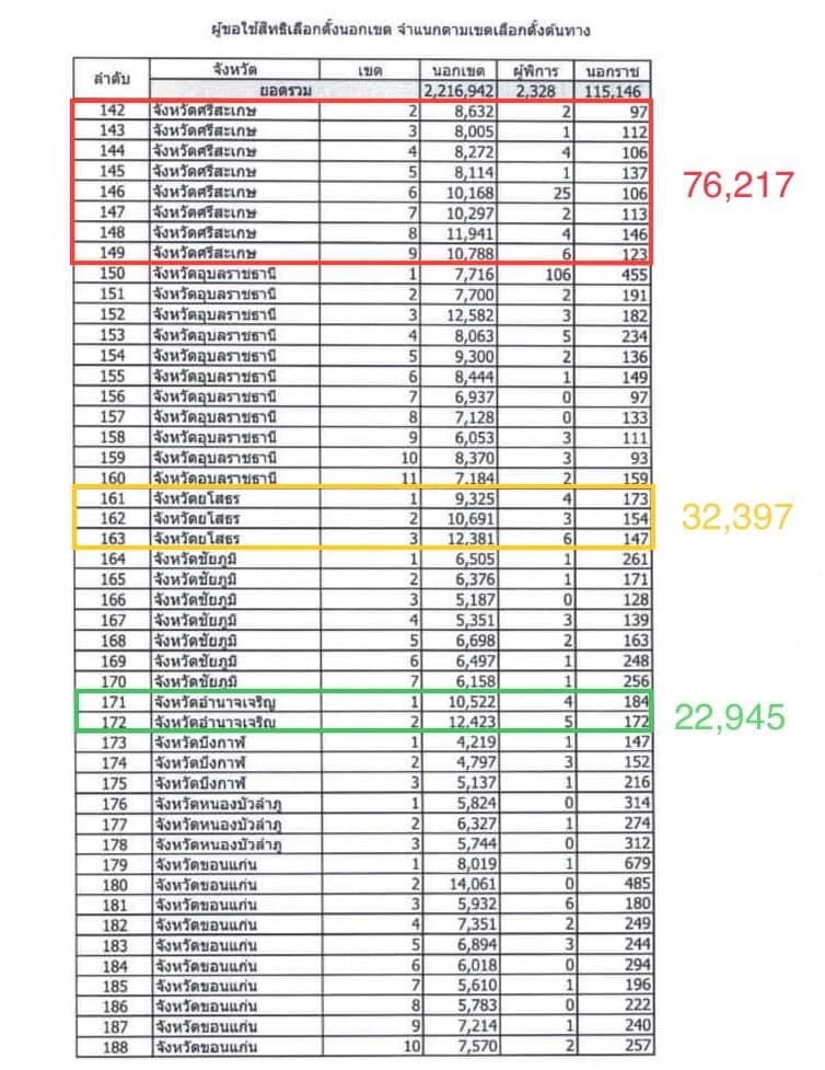 โดยสามารถสังเกตุเปรียบเทียบได้จากสถิติเดิมของการเลือกตั้งล่วงหน้าครั้งปี พ.ศ. 2562 ในการเลือกตั้งล่วงหน้าครั้งนี้ บางจังหวัด เช่น จังหวัดอำนาจเจริญ มีประชาชน ถูกหลอกจากผู้สมัครฯ นำเอาบัตรประชาชนไปลงทะเบียนเลือกตั้งล่วงหน้าทางออนไลน์ โดยไม่ได้เป็นไปตามเจตนารมย์ของตนเอง จังหวัดอำนาจเจริญ มีเพียง 2 เขต แต่มีผู้ลงทะเบียนเลือกตั้งล่วงหน้าถึง 22,945 ราย จังหวัดศรีสะเกษ มีผู้ลงทะเบียนเลือกตั้งล่วงหน้า จำนวน 76,217 ราย (ยังไม่รวมเขต 1) จังหวัดยโสธร มีผู้ลงทะเบียนเลือกตั้งล่วงหน้า จำนวน 32,397 ราย เพิ่มขึ้นจากเมื่อปี พ.ศ. 2562 มากอย่างผิดปกติ อันเป็นเรื่องผิดสังเกตุเป็นอย่างยิ่ง