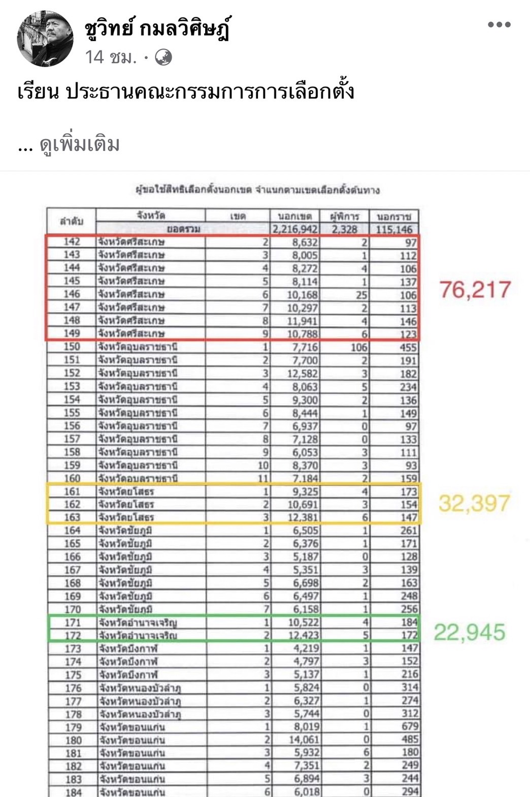 วันนี้(7 พ.ค. 66) นายชูวิทย์ กมลวิศิษฎ์ โพสต์ข้อความผ่านเพจเฟซบุ๊ก ระบุว่า “เรียน ประธานคณะกรรมการการเลือกตั้ง เรื่อง ขอให้ท่านดำเนินการสืบสวนสอบสวนการลงคะแนนเสียงเลือกตั้งล่วงหน้าในเขตที่มีการลงทะเบียนมากผิดปกติ รวม 3 จังหวัด เนื่องจากการเลือกตั้งล่วงหน้าวันที่ 7 พฤษภาคม 2566 มีจำนวนผู้ลงทะเบียนเลือกตั้งล่วงหน้าในแต่ละเขตเลือกตั้งทั่วประเทศมากผิดปกติ
