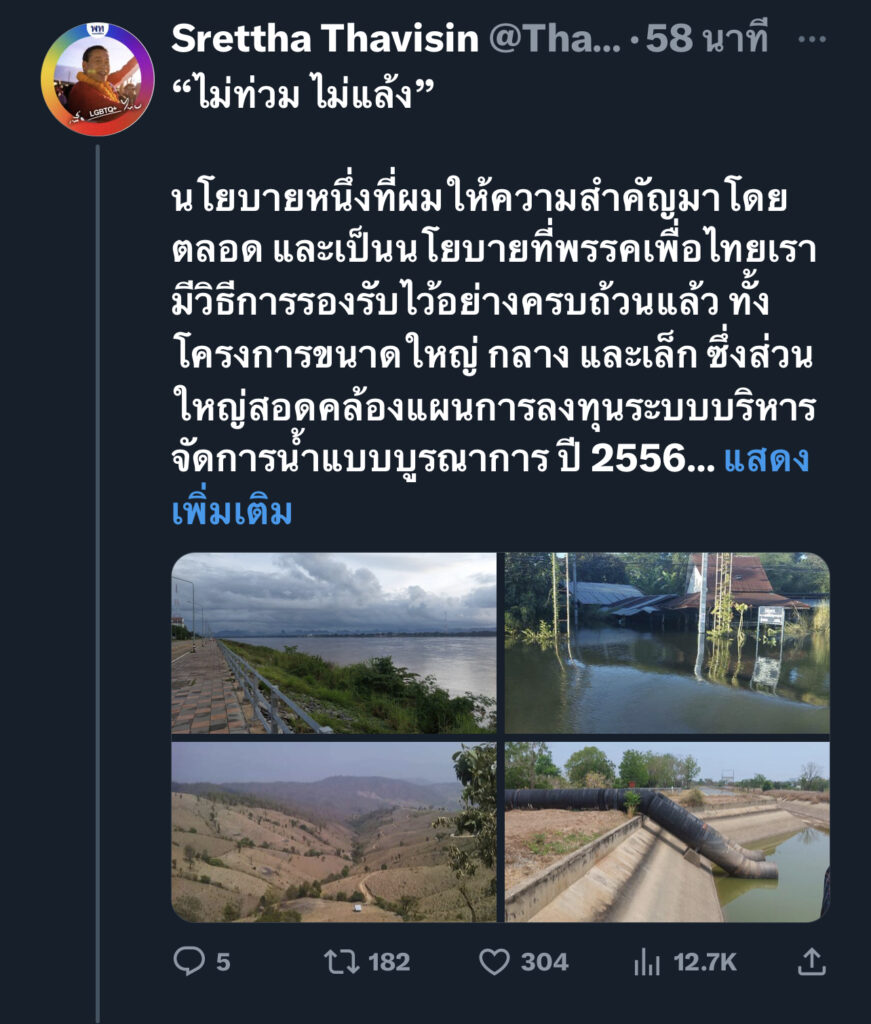 “เศรษฐา”ทวิตนโยบายไม่ท่วม-ไม่แล้ง เป็นสิ่งที่ให้ความสำคัญมาตลอด บอก เพื่อไทยมีการรองรับครบถ้วนสอดคล้องแผนลงทุนจัดการน้ำบูรณาการปี 56 แต่สะดุดเพราะถูกรัฐประหาร
