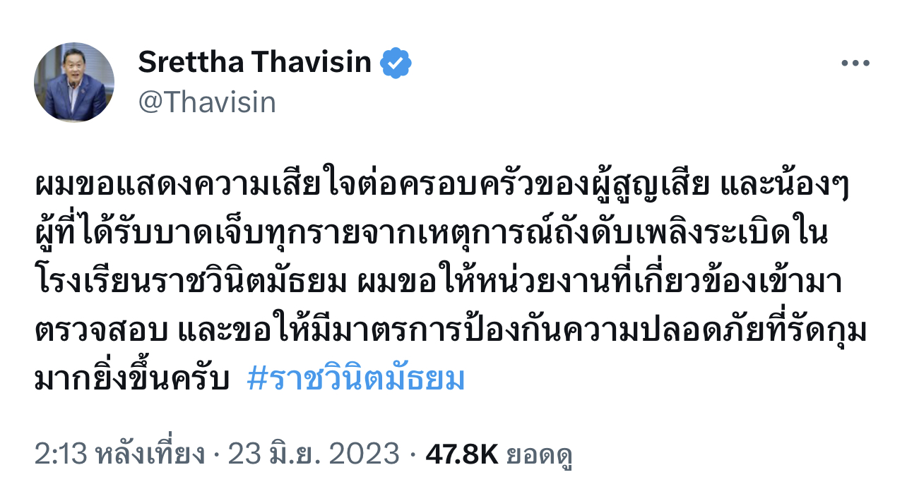 นายเศรษฐา ทวีสิน แคนดิเดตนายกรัฐมนตรีพรรคเพื่อไทย โพสต์ข้อความผ่านทวิตเตอร์ ต่อเหตุการณ์ถังดับเพลิงระเบิดในโรงเรียนราชวินิตมัธยม ว่า ”ผมขอแสดงความเสียใจต่อครอบครัวของผู้สูญเสีย และน้องๆ ผู้ที่ได้รับบาดเจ็บทุกรายจากเหตุการณ์ถังดับเพลิงระเบิดในโรงเรียนราชวินิตมัธยม ผมขอให้หน่วยงานที่เกี่ยวข้องเข้ามาตรวจสอบ และขอให้มีมาตรการป้องกันความปลอดภัยที่รัดกุมมากยิ่งขึ้น