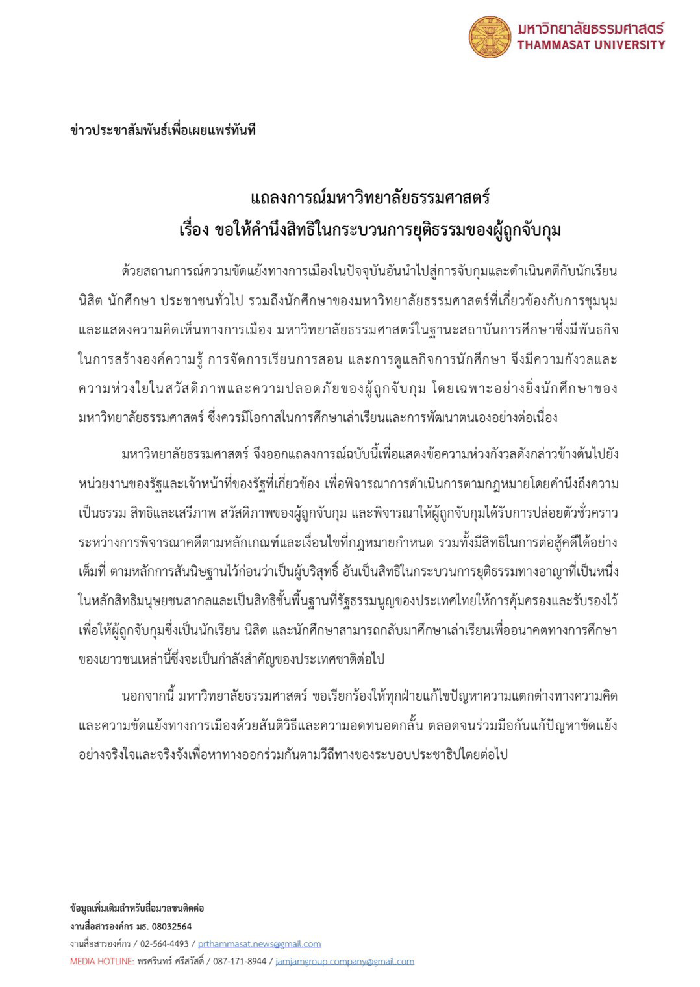 มธ.ออกแถลงการณ์ ให้หน่วงงาน จนท.รัฐ คำนึงสิทธิ เสรีภาพของผู้ถูกจับกุม -ขอให้ปล่อยตัวชั่วคราว เพื่อให้ นศ.กลับมาศึกษาได้