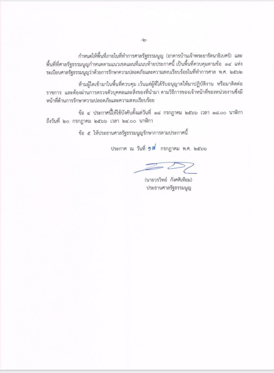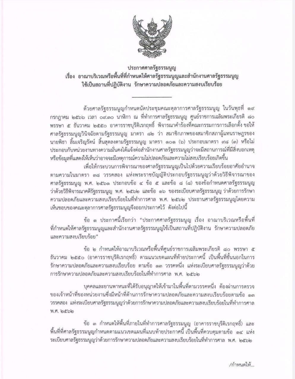ขณะเดียวกันศาลรัฐธรรมนูญก็ได้มีการออกประกาศเรื่องอาณาบริเวณหรือพื้นที่ที่กำหนดให้ศาลรัฐธรรมนูญและสำนักงานศาลรัฐธรรมนูญใช้เป็นสถานที่ปฏิบัติงานรักษาความปลอดภัยและความสงบเรียบร้อย โดยระบุว่าหน่วยงานทางความมั่นคงได้แจ้งต่อสำนักงานศาลรัฐธรรมนูญว่าจะมีสถานการณ์ที่มีสิ่งบอกเหตุหรือข้อมูลที่แสดงให้เห็นว่าอาจจะมีเหตุการณ์ความไม่ปลอดภัยและความไม่สงบเรียบร้อยเกิดขึ้น