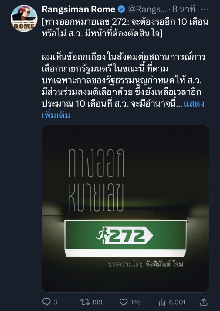 นายรังสิมันต์ โรม สส.บัญชีรายชื่อและโฆษกพรรคก้าวไกล โพสต์ข้อความผ่านทวิตเตอร์ ถึงทางออกของการจัดตั้งรัฐบาลในครั้งนี้ โดยระบุว่า ทางออกหมายเลข 272: จะต้องรออีก 10 เดือนหรือไม่ สว. มีหน้าที่ต้องตัดสินใจ