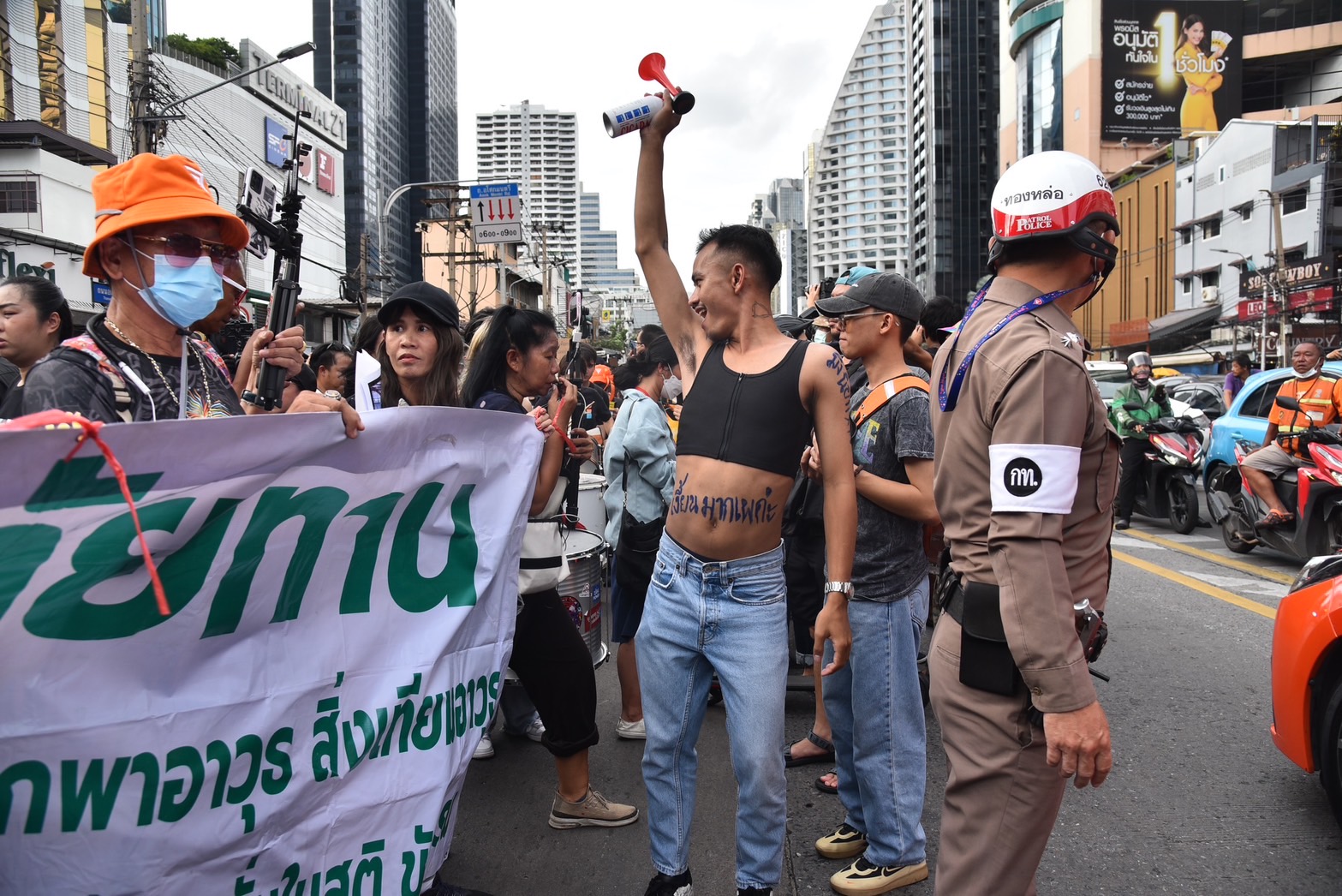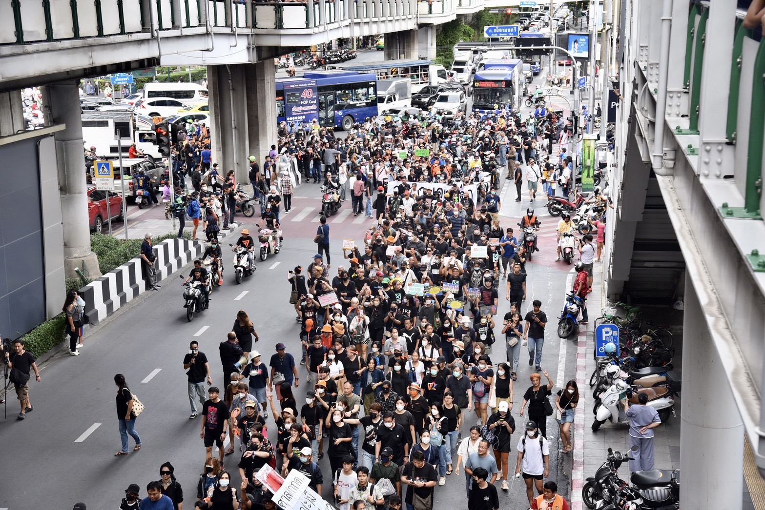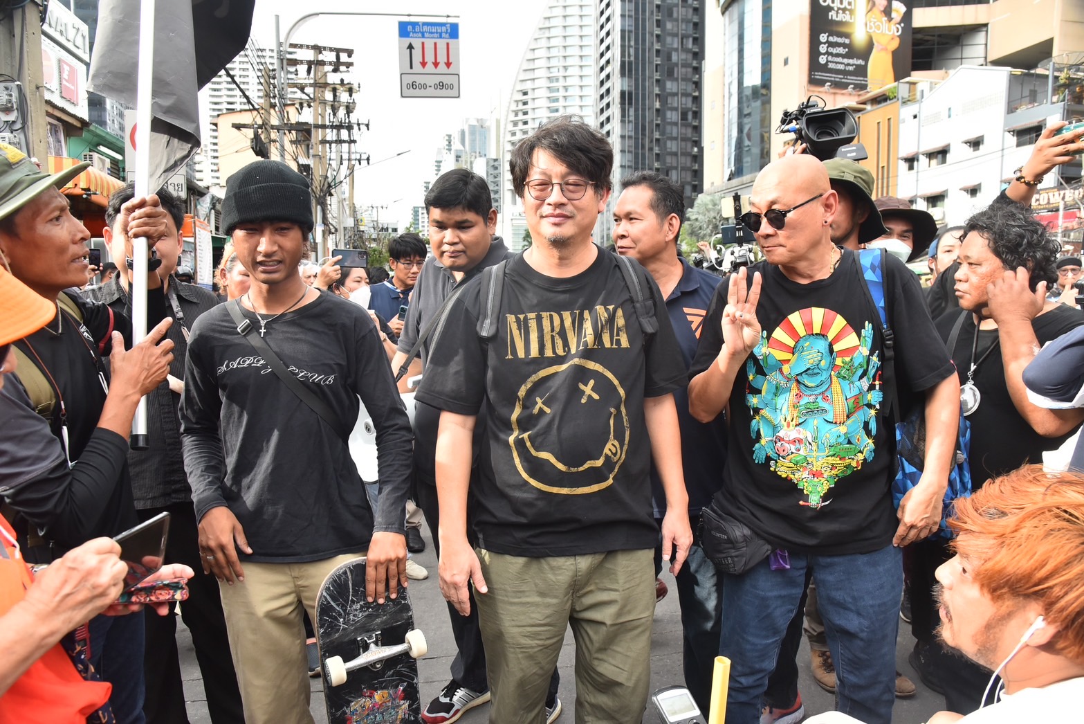 และต้องมุ่งเน้นหลักการทางประชาธิปไตย หลังจากพูดคุยกับสื่อมวลชนเสร็จ ทางบก.ลายจุดก็ได้มีการนำรูปของตัวเองวางลงที่พื้น และให้เหล่ามวลชนเหยียบไปที่รูปขิงตนเองเพื่อเป็นการขอโทษ นพ.ชลน่านตามที่กล่าวไปข้างต้น จากนั้นจึงเริ่มพาเหล่ามวลชนเคลื่อนขบวนไปยัง สี่แยกราชประสงค์ โดยการเดินเท้า และมีการใช้รถจักรยานยนต์ รถยนต์ ในการเคลื่อนขบวนครั้งนี้อีกด้วย โดยตลอดระยะเวลาของการร่วมตัวตั้งขบวน จนถึงการเคลื่อนขบวน เป็นไปด้วยความเรียบร้อยไม่มีติดขัดอะไร ทางเจ้าหน้าที่ตำรวจ และเจ้าหน้าที่กู้ภัย ก็ได้มีการคอยอำนวยความสะดวกทางจราจรให้อีกด้วยเช่นกัน