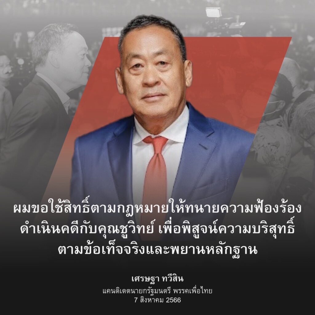 “เศรษฐา” โพสต์ข้อความขอใช้สิทธิ์ตามกฏหมาย ฟ้องดำเนินคดี “ชูวิทย์” พิสูจน์ความบริสุทธิ์