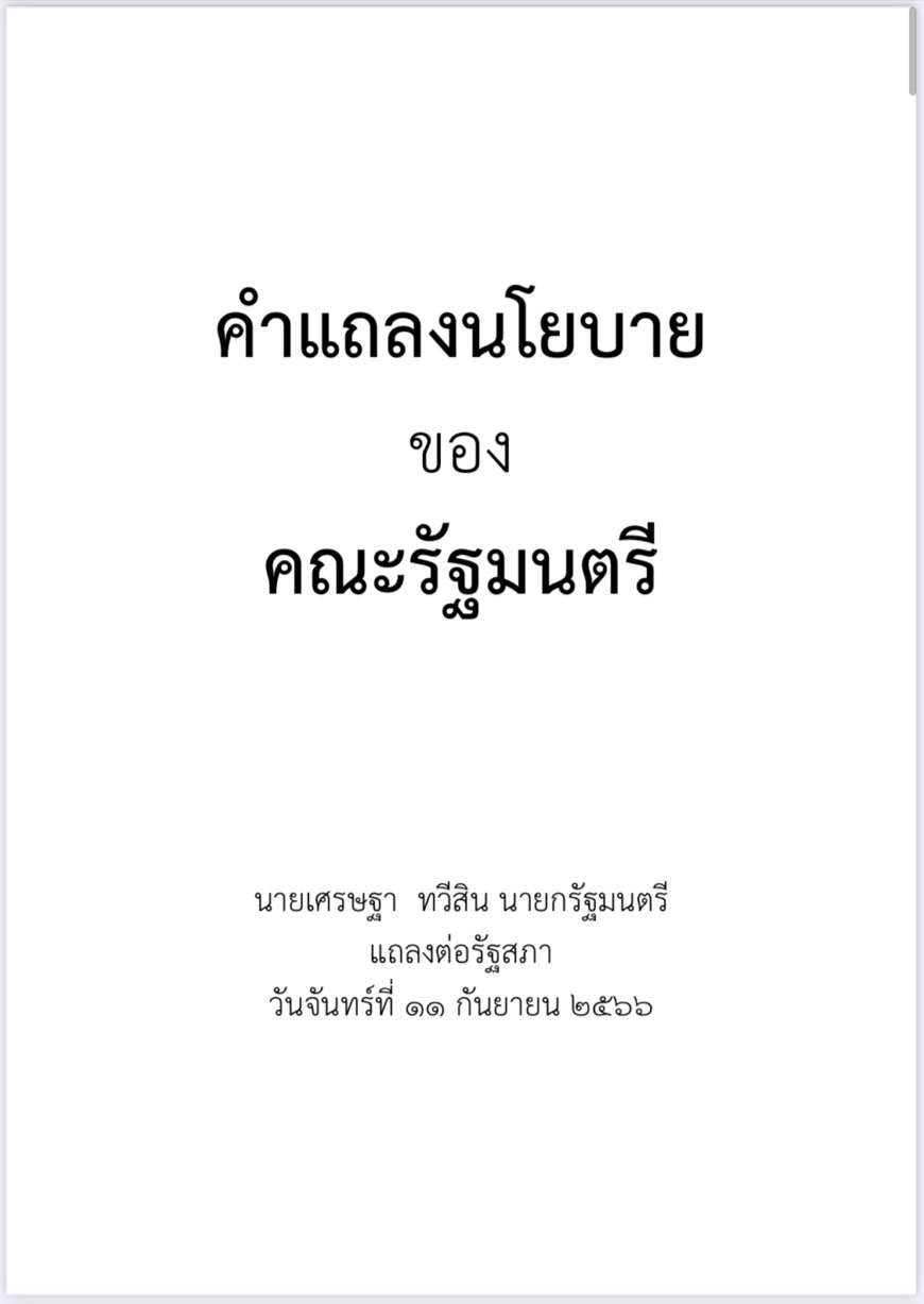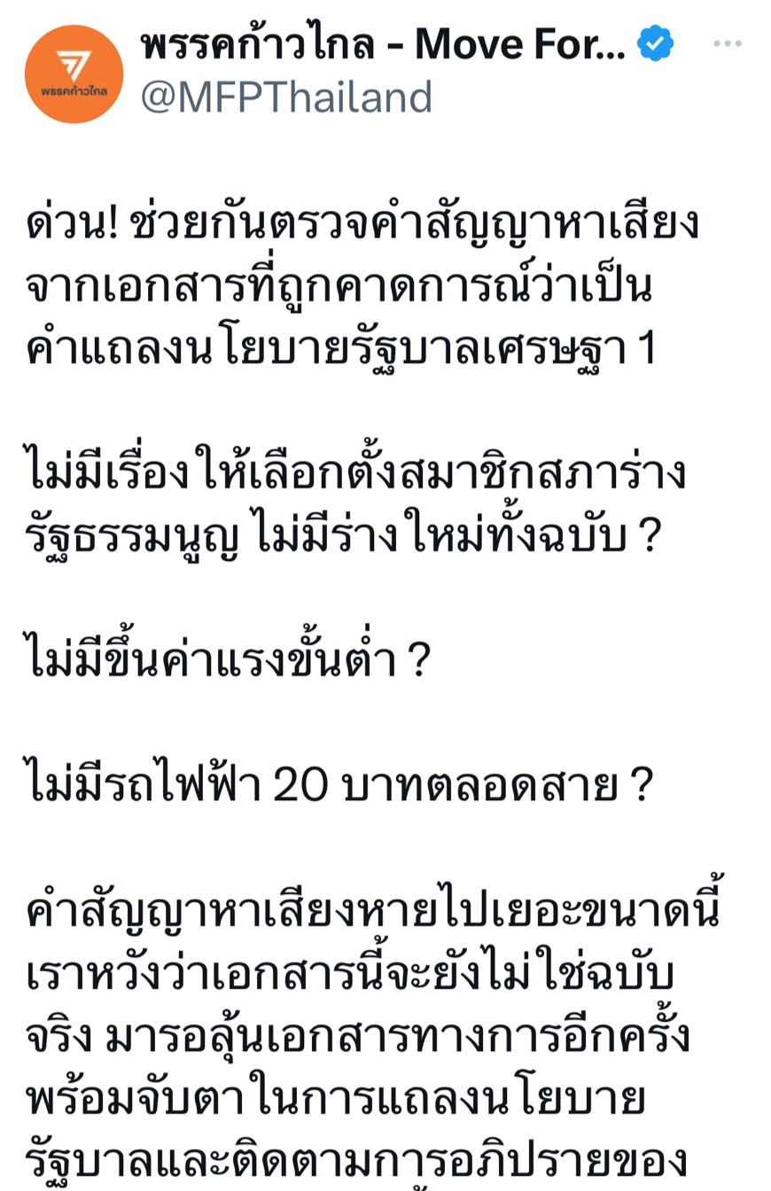 “ด่วน! ช่วยกันตรวจคำสัญญาหาเสียงจากเอกสารที่ถูกคาดการณ์ว่าเป็นคำแถลงนโยบายรัฐบาลเศรษฐา 1