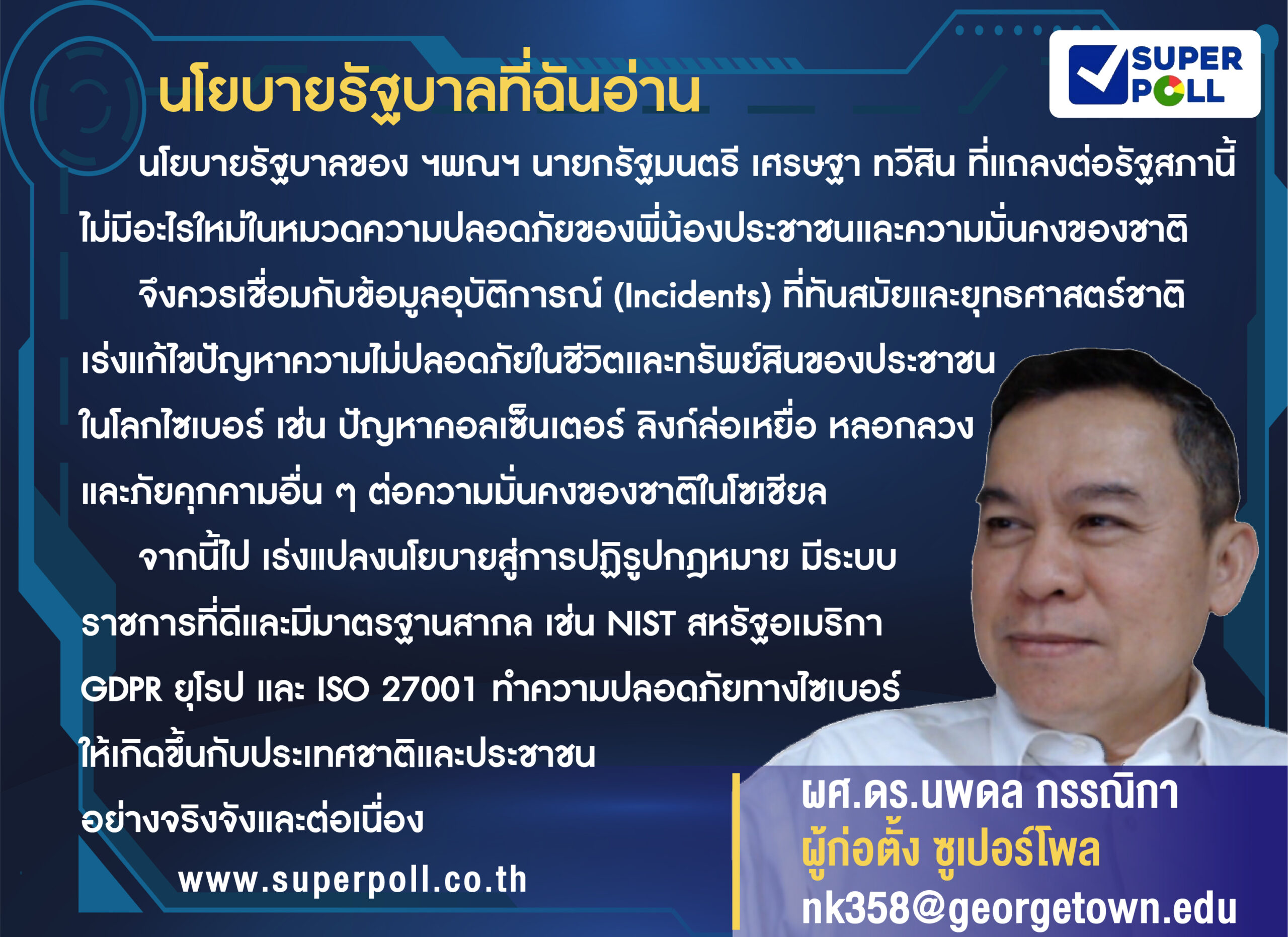 จึงเสนอให้นำนโยบายรัฐบาลนี้ไปเชื่อมโยงกับข้อมูลที่ทันสมัยและยุทธศาสตร์ชาติ มาช่วยป้องกันแก้ไขความทุกข์ยากเดือดร้อนของประชาชนและความไม่มั่นคงของชาติ นำอุบัติการณ์ (Incidents) เสาหลักของชาติ ศาสนาและพระมหากษัตริย์ที่ถูกสั่นคลอนและความไม่ปลอดภัยในชีวิตและทรัพย์สินของประชาชนในโลกไซเบอร์มาแปลงสู่การปฏิรูปกฎหมาย มีระบบราชการที่ดีและมีมาตรฐานสากลของความปลอดภัยทางไซเบอร์ ที่นานาประเทศเขามีมาตรฐานกลางและกฎหมายดูแลความปลอดภัยทางไซเบอร์อยู่ เช่น NIST ของสหรัฐอเมริกา GDPR ของสหภาพยุโรป และ ISO 27001 เป็นต้น โดยรัฐบาลชุดปัจจุบันนำโดย ฯพณฯ นายกรัฐมนตรี เศรษฐา ทวีสิน น่าจะนำไปปรับประยุกต์ใช้เข้ากับประเทศไทยให้สำเร็จเป็นผลงานชิ้นโบว์แดงของรัฐบาลชุดปัจจุบันนี้