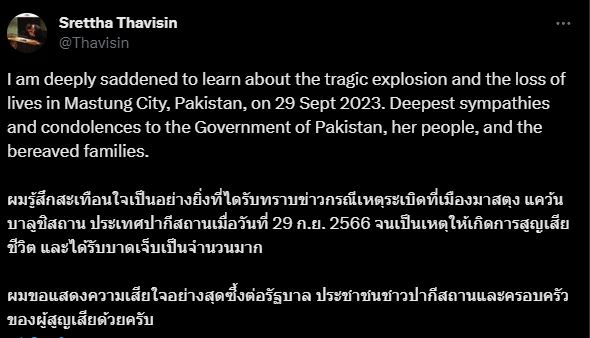 นายเศรษฐา ทวีสิน นายกรัฐมนตรีและรัฐมนตรีว่าการกระทรวงการคลัง โพสต์ข้อความแสดงความเสียใจ ต่อเหตุระเบิดที่เมืองมาสตุง แคว้นบาลูชิสถาน ประเทศปากีสถานเมื่อวันที่ 29 กันยายนที่ผ่านมา โดยระบุว่า