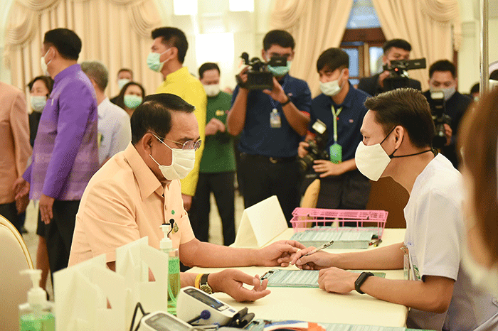 บรรยากาศภายในตึกสันติไมตรี ทำเนียบรัฐบาล มีบรรดารัฐมนตรีที่สมัครใจเข้ารับวัคซีน โควิด-19 จำนวน 15 คน ทยอยลงทะเบียน และวัดความดันตามขั้นตอน ก่อนที่ พล.อ.ประยุทธ์ จันทร์โอชา นายกรัฐมนตรีและรัฐมนตรีว่าการกระทรวงกลาโหม จะฉีดวัคซีนของ Astrazeneca เป็นคนแรกโดยเปิดเผยก่อนเข้ารับการฉีดว่า “ตนเองมีความพร้อม” และวัคซีนของ Astrazeneca ได้รับการตรวจสอบเรื่องความปลอดภัยเมื่อสัปดาห์ที่ผ่านมา ซึ่งไม่มีผลกระทบต่อการฉีดวัคซีนในวันนี้ โดยเป็นการฉีดวัคซีนของ Astrazeneca เข็มแรกในประเทศไทย แต่ไม่ได้ฉีดเฉพาะนายกรัฐมนตรีเท่านั้นยังมีคณะรัฐมนตรีและข้าราชการที่เกี่ยวข้องกับคนจำนวนมากจะได้รับการฉีดในวันนี้ไปด้วย เพื่อเป็นการสร้างความมั่นใจให้กับประชาชนโดยรวมซึ่งสิ่งที่ตนเองกังวลมากที่สุดในขณะนี้ คือ ทำอย่างไรให้ประชาชนในพื้นที่เสี่ยงและประชาชนกลุ่มเสี่ยง ได้รับการฉีดวัคซีนให้เร็วที่สุด ซึ่งเป็นเรื่องที่รัฐบาลได้เตรียมการและบริหารจัดการ จัดหาวัคซีนมาโดยตลอด ที่ได้พิจารณาวัคซีนที่เหมาะสมกับประเทศไทย และไทยมีส่วนร่วมในการวิจัยและพัฒนา