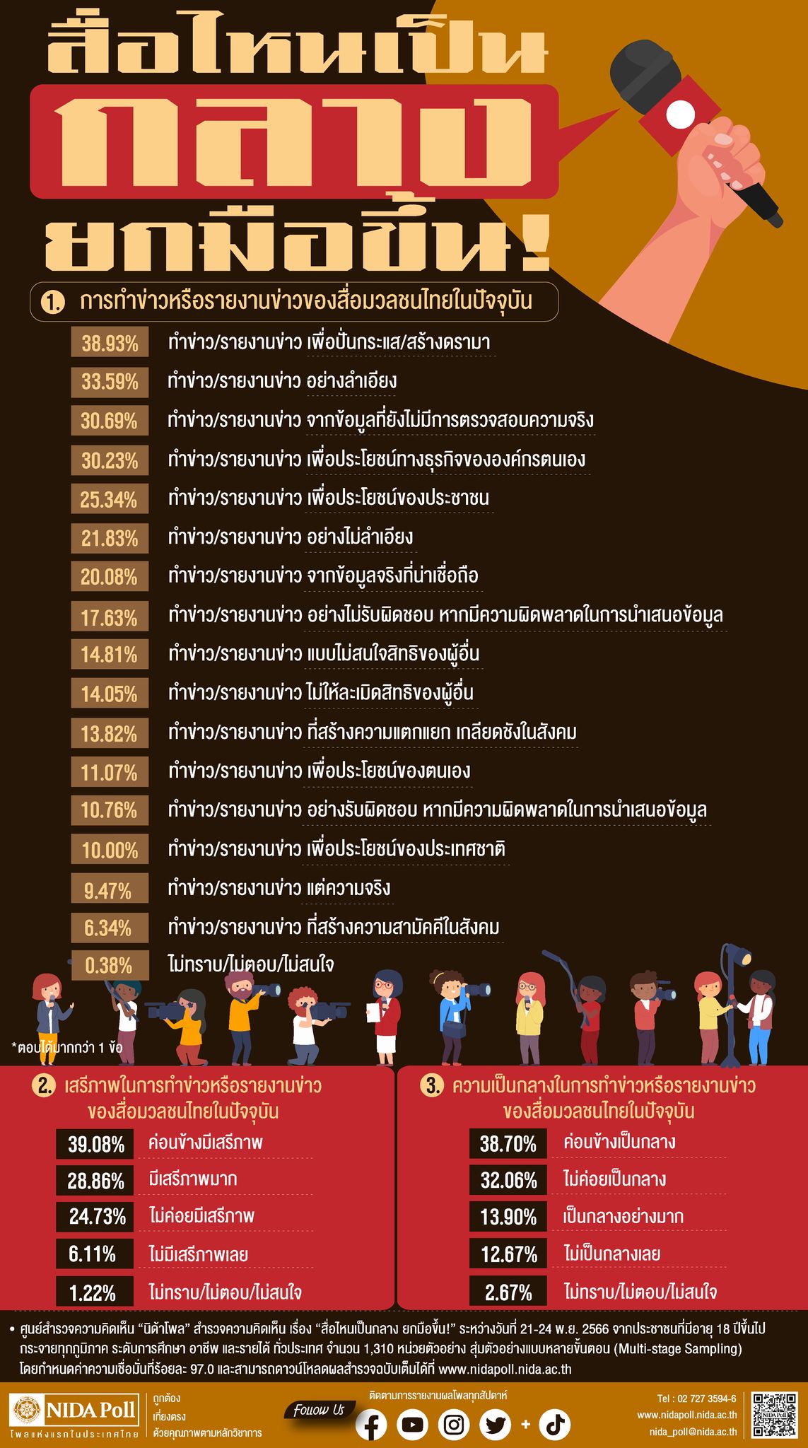 ศูนย์สำรวจความคิดเห็น “นิด้าโพล” สถาบันบัณฑิตพัฒนบริหารศาสตร์ (นิด้า) เปิดเผยผลสำรวจของประชาชน เรื่อง “สื่อไหนเป็นกลาง ยกมือขึ้น!” ทำการสำรวจระหว่างวันที่ 21-24 พฤศจิกายน 2566 จากประชาชนที่มีอายุ 18 ปีขึ้นไป กระจายทุกภูมิภาค ระดับการศึกษา อาชีพ และรายได้ ทั่วประเทศ รวมทั้งสิ้น จำนวน 1,310 หน่วยตัวอย่าง