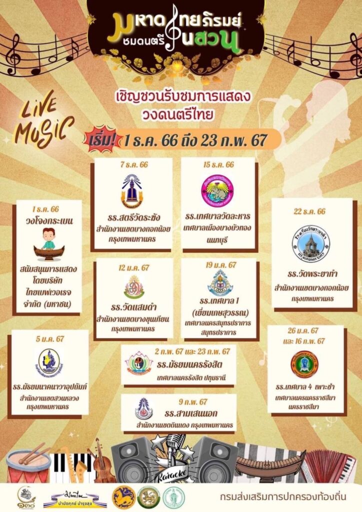 น.ส.ไตรศุลี กล่าวว่า ในกิจกรรมฯ จะมีวงดนตรีไทยจากโรงเรียนต่างๆ ในสังกัดกรมส่งเสริมการปกครองท้องถิ่นและกรุงเทพมหานครผลัดเปลี่ยนหมุนเวียน มาแสดงให้รับฟังทุกเย็นวันศุกร์ ในช่วงตลอด 3 เดือนนี้ ตั้งแต่เวลา 17.00 -19.00 น. บริเวณสวนมหาดไทย ซึ่งในสัปดาห์แรกของกิจกรรมฯ เมื่อวันที่ 1 ธ.ค. 66 เป็นการแสดงของวงโจงกระเบน วงดนตรีไทยร่วมสมัยที่ผสมผสานระหว่างดนตรีไทยและดนตรีสากล ซึ่งนายอนุทิน ได้ร่วมเป่าขลุ่ยบรรเลงเพลงร่วมกับนักดนตรีด้วย
