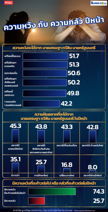 ที่น่าสนใจคือ เมื่อถามถึง ความฝันอยากได้ของประชาชนจาก นายเศรษฐา ทวีสิน นายกรัฐมนตรี พบว่า ความฝันอยากได้รถยนต์คันใหม่ มาเป็นอันดับที่ 1 คือ ร้อยละ 45.3 รองลงมาคือ อยากได้สิทธิประกันสังคม สถานพยาบาลแห่งใหม่ ร้อยละ 43.8 อยากได้ขึ้นเงินเดือน ร้อยละ 43.3 อยากได้บ้านหลังใหม่ ร้อยละ 42.8 อยากมีงานทำ มีรายได้เสริม ร้อยละ 35.1 อยากได้การศึกษาใหม่ ร้อยละ 25.7 อยากเปลี่ยนงานใหม่ ร้อยละ 16.8 และอยากได้คนรักใหม่ ร้อยละ 8.0 ตามลำดับ ที่น่าพิจารณาคือ ประชาชนส่วนใหญ่หรือร้อยละ 74.3 มีความหวังที่จะก้าวต่อไปในปีหน้า ในขณะที่ร้อยละ 25.7 มีความกลัว