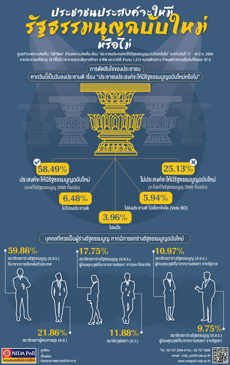 ศูนย์สำรวจความคิดเห็น “นิด้าโพล” สถาบันบัณฑิตพัฒนบริหารศาสตร์ (นิด้า) เปิดเผยผลสำรวจของประชาชน เรื่อง “ประชาชนประสงค์จะให้มีรัฐธรรมนูญฉบับใหม่หรือไม่” ทำการสำรวจระหว่างวันที่ 17–18 มี.ค.ที่ผ่านมา จากประชาชนที่มีอายุ 18 ปีขึ้นไป กระจายทุกภูมิภาค ระดับการศึกษา และอาชีพ ทั่วประเทศ รวมทั้งสิ้น 1,313 หน่วยตัวอย่าง พบว่า ร้อยละ 58.49 ระบุ ประสงค์จะให้มีรัฐธรรมนูญฉบับใหม่ (จะแก้ไขรัฐธรรมนูญ 2560 ทั้งฉบับ), ร้อยละ 25.13 ระบุ ไม่ประสงค์จะให้มีรัฐธรรมนูญฉบับใหม่ (จะไม่แก้ไขรัฐธรรมนูญ 2560 ทั้งฉบับ), ร้อยละ 6.48 ระบุว่า ไม่ไปลงประชามติ, ร้อยละ 5.94 ระบุ ไปลงประชามติไม่เลือกข้อใด (Vote NO) และ ร้อยละ 3.96 ระบุว่า ไม่แน่ใจ
