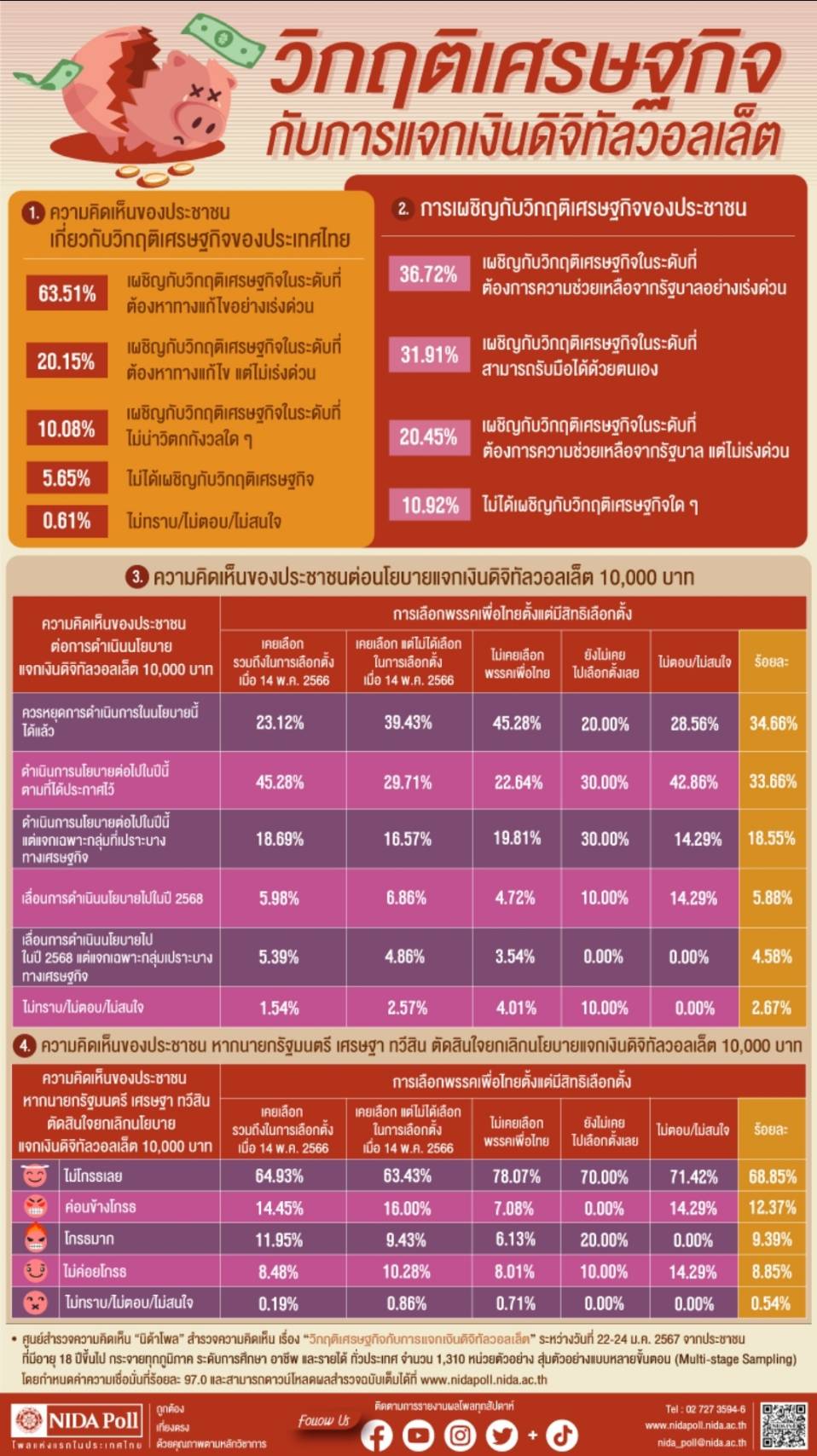 สถาบันบัณฑิตพัฒนบริหารศาสตร์ (นิด้า) เปิดเผยผลสำรวจของประชาชน เรื่อง “วิกฤติเศรษฐกิจกับการแจกเงินดิจิทัลวอลเล็ต” โดยทำการสำรวจระหว่างวันที่ 22-24 มกราคม 2567 จากประชาชนที่มีอายุ 18 ปีขึ้นไป ทั่วประเทศ รวมทั้งสิ้น จำนวน 1,310 หน่วยตัวอย่าง เมื่อถามความคิดเห็นของประชาชนเกี่ยวกับวิกฤติเศรษฐกิจของประเทศไทยในขณะนี้