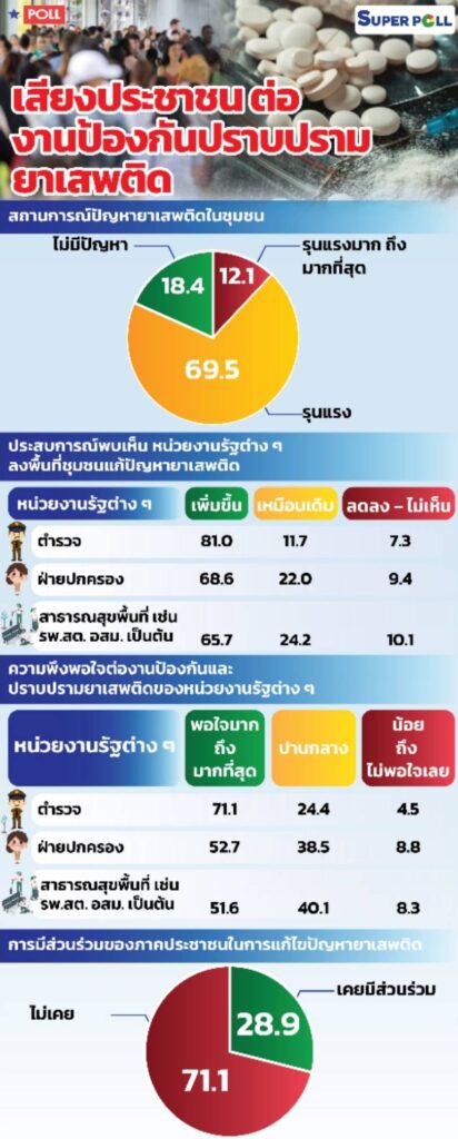 SUPERโพลระบุสถานกาณ์ปัญหายาเสพติดในชุมชนรุนแรง ประชาชนพอใจนโยบาล “รัฐบาลเศรษฐา” ตำรวจลงพื้นที่ถี่ขึ้น แต่สังคมมีส่วนร่วมน้อย