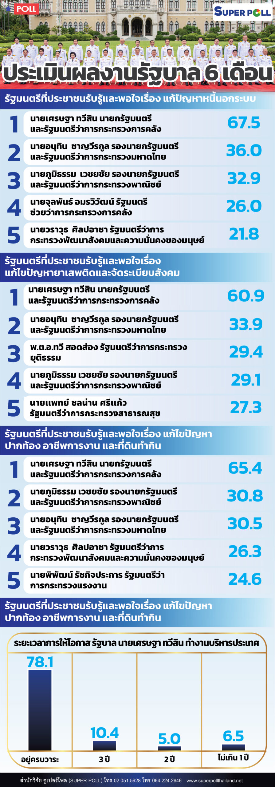 SUPERโพลประเมินงานรัฐบาล 6 เดือน พอใจ “นายกเศรษฐา-อนุทิน” แก้หนี้ ขณะ 78.1% หนุนให้อยู่ครบเทอม 4 ปี