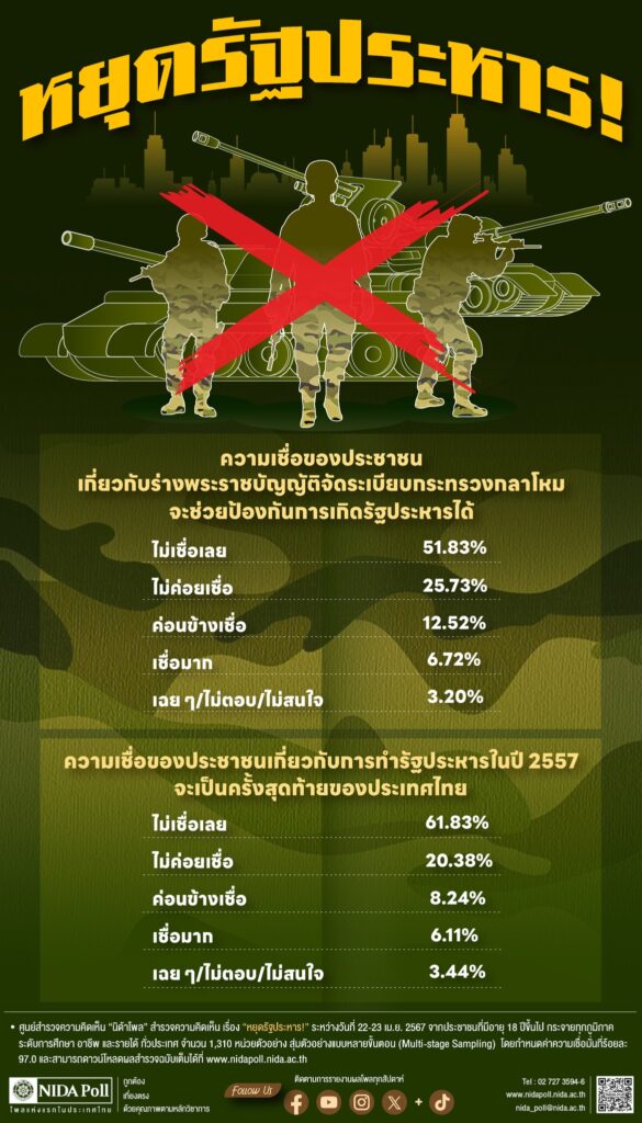 สถาบันบัณฑิตพัฒนบริหารศาสตร์ (นิด้า) เปิดเผยผลการสำรวจของประชาชน ที่มีอายุ 18 ปีขึ้นไป ทั่วประเทศ รวมทั้งสิ้น จำนวน 1,310 หน่วยตัวอย่าง เรื่อง “หยุดรัฐประหาร!” ทำการสำรวจระหว่างวันที่ 22-23 เมษายน 2567