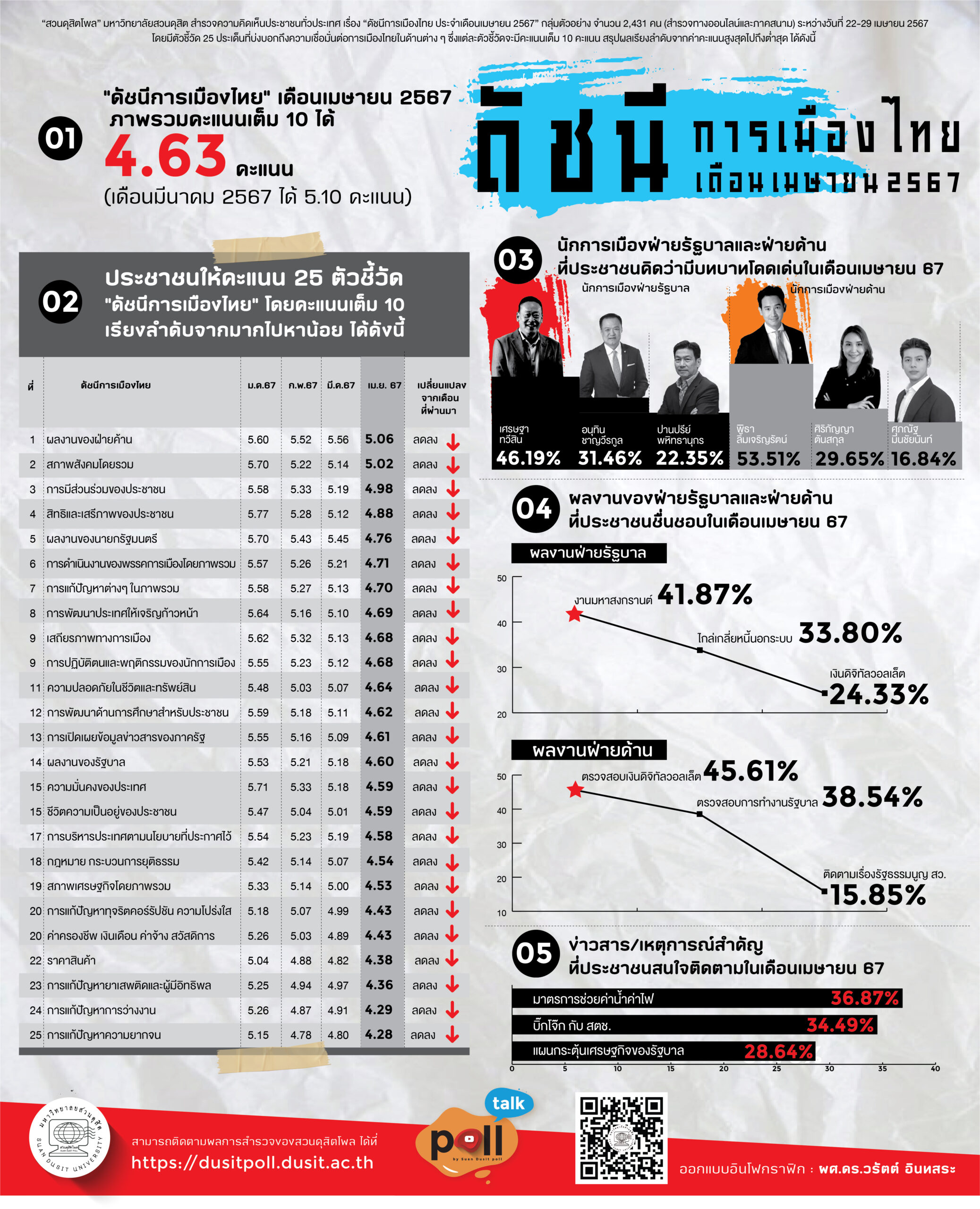 “สวนดุสิตโพล” มหาวิทยาลัยสวนดุสิต เปิดเผยผลสำรวจความคิดเห็นประชาชนทั่วประเทศ เรื่อง “ดัชนีการเมืองไทย ประจำเดือนเมษายน 2567” จากกลุ่มตัวอย่าง จำนวน 2,431 คน (สำรวจทางออนไลน์และภาคสนาม) ระหว่างวันที่ 22-29 เมษายน 2567 พบว่า กลุ่มตัวอย่างให้คะแนนภาพรวมดัชนีการเมืองไทยประจำเดือนเมษายน 2567 เฉลี่ย 4.63 คะแนน ลดลงจากเดือนมีนาคม 2567 ที่ได้ 5.10 คะแนน