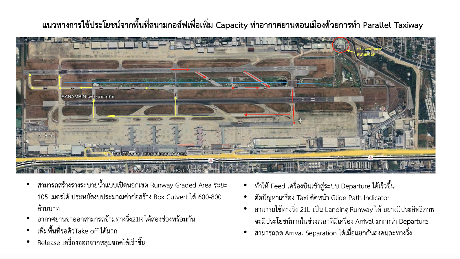 ขณะที่ตัวแทนจาก ทอท.ได้ชี้แจงในประเด็นสำคัญ โดยโต้แย้งกองทัพอากาศว่า ทอท.มีแผนที่จะใช้พื้นที่บริเวณสนามกอล์ฟกานตรัตน์ทำทางขับคู่ขนาน (parallel taxiway) ไปกับรันเวย์ทั้งสองข้าง เพื่อเพิ่มขีดความสามารถในการรองรับเที่ยวบินของสนามบินดอนเมือง จากเดิม 60 เที่ยวบินต่อชั่วโมง กลายเป็น 70-75 เที่ยวบินต่อชั่วโมง