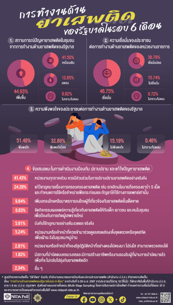 ศูนย์สำรวจความคิดเห็น “นิด้าโพล” สถาบันบัณฑิตพัฒนบริหารศาสตร์ (นิด้า) ร่วมกับสำนักงานคณะกรรมการป้องกันและปราบปรามยาเสพติด (สำนักงาน ป.ป.ส.) เปิดเผยผลการสำรวจของประชาชน เรื่อง “การทำงานด้านยาเสพติดของรัฐบาล ในรอบ 6 เดือน” โดยทำการสำรวจระหว่างวันที่ 5-29 เมษายน 2567 จากประชาชนที่มีอายุ 18 ปีขึ้นไป