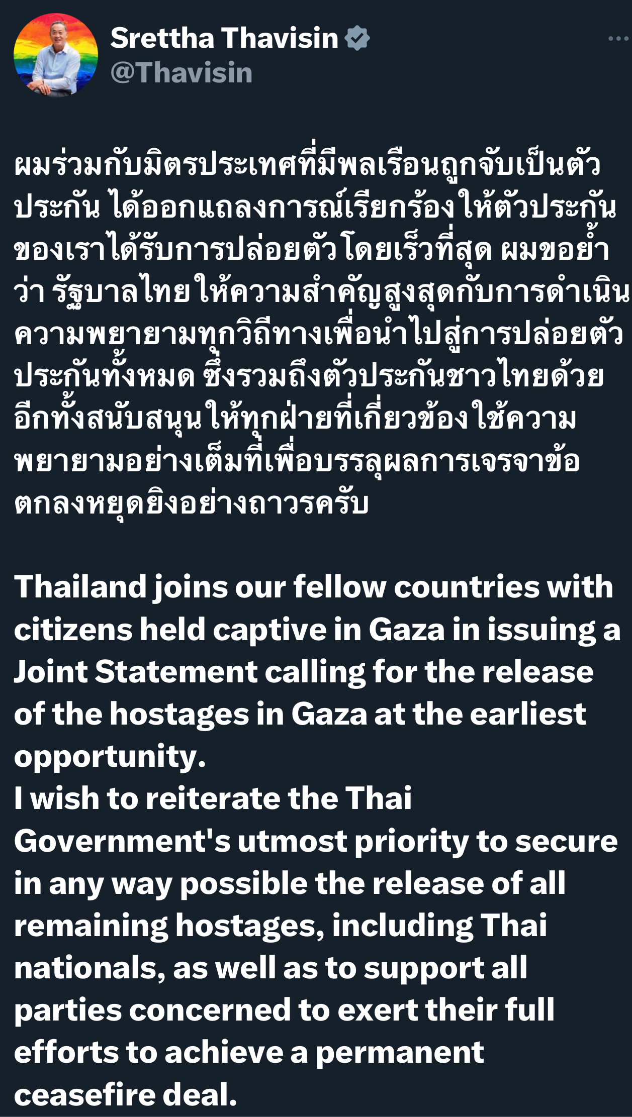 นายเศรษฐา ทวีสิน นายกรัฐมนตรี โพสต์ข้อความผ่าน X ระบุว่า ผมร่วมกับมิตรประเทศที่มีพลเรือนถูกจับเป็นตัวประกัน ในฉนวนกาซ่า ได้ออกแถลงการณ์เรียกร้องให้ตัวประกันของเราได้รับการปล่อยตัวโดยเร็วที่สุด ผมขอย้ำว่า รัฐบาลไทยให้ความสำคัญสูงสุดกับการดำเนินความพยายามทุกวิถีทางเพื่อนำไปสู่การปล่อยตัวประกันทั้งหมด ซึ่งรวมถึงตัวประกันชาวไทยด้วยอีกทั้งสนับสนุนให้ทุกฝ่ายที่เกี่ยวข้องใช้ความพยายามอย่างเต็มที่เพื่อบรรลุผลการเจรจาข้อตกลงหยุดยิงอย่างถาวรครับ